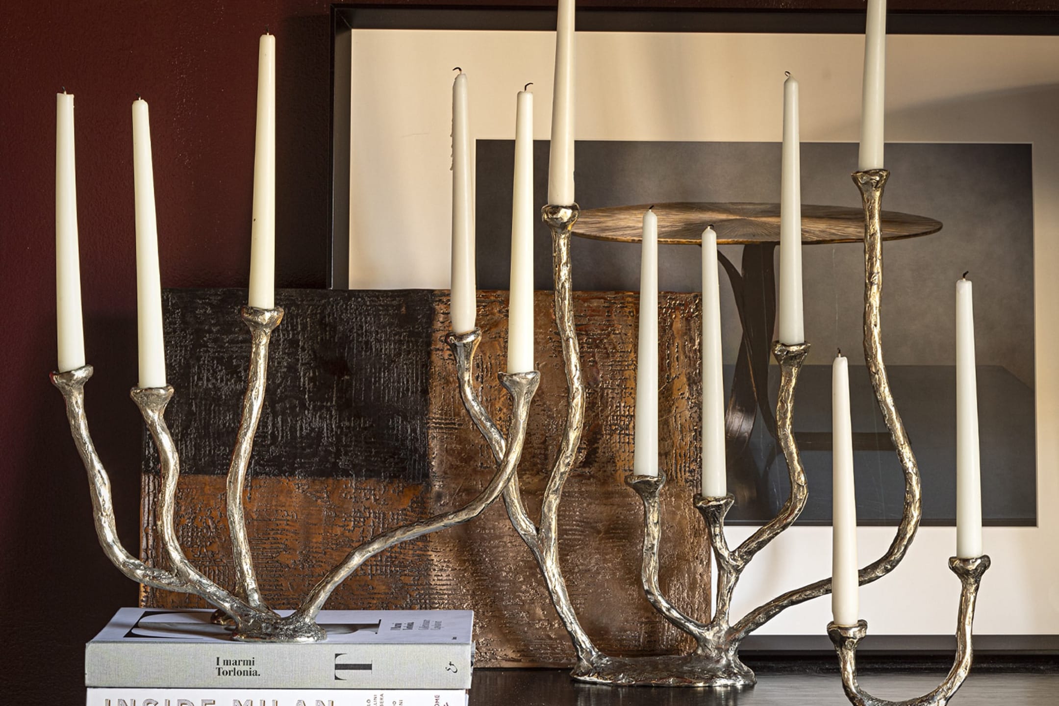 Deftly employing the lost-wax casting technique, each of the esteemed Milanese metalworker’s one-of-a-kind holders cradles candles in sturdy arms fashioned to resemble sculpted stems.