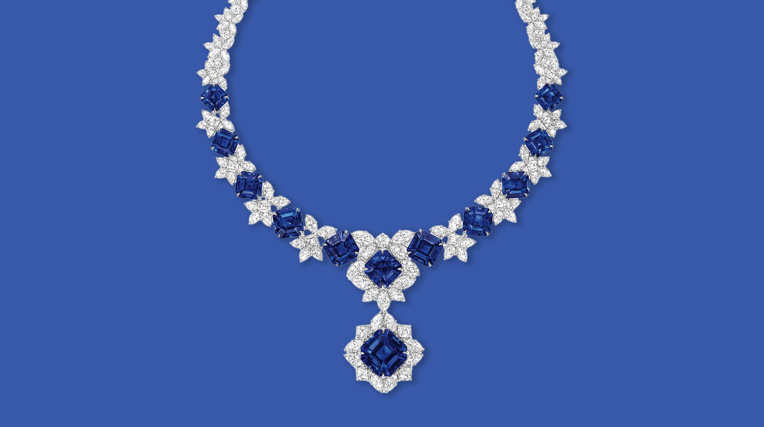 Part of the Royal Adornments collection, the Countess Necklace features an extraordinary 30.27 carat octagonal-cut sapphire with an additional 11 sapphires set among clusters of brilliant diamonds.