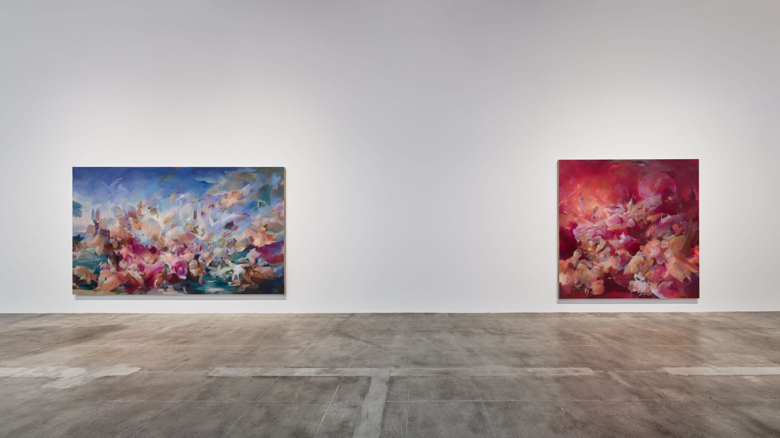 Drawing on the languages of French Rococo, Italian Baroque, and Abstract Expressionism, Flora Yukhnovich creates lush, layered paintings that beautifully blur the line between representation and abstraction. With bold, gestural brushstrokes, the young British artist blends historic imagery to produce contemporary takes on the past. Vibrantly referencing 18th-century painters like Watteau, Tiepolo, and Boucher, she explores ideas of femininity by ambiguously merging women’s bodies with elements of nature. Echoing the fête galante style of Rococo painting in her large-scale canvases, her first solo show in Los Angeles and debut with the gallery, appropriately titled “Bacchanalia,” offers an Abstract Expressionist vision of frolicking figures in parkland settings beneath celestial skies. With a site-specific mural created as a contemporary response to Boucher’s iconic Four Seasons series currently on view at New York’s Frick Collection, her L.A. show features nine new paintings that, to paraphrase the artist, capture a tipping point by layering imagery until structure yields to excess.
