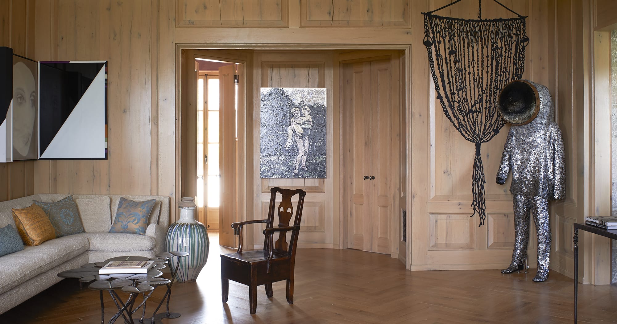So what is the outcome of so much boldness? Serenity. Inspired by antique Flemish and Dutch farmhouses, Hamilton and her clients—philanthropists and art enthusiasts, but, above all, supporters of living artists—many of whom are from Brooklyn, New York—designed rooms warmed by rustic nuances. Draperies are delicately woven, carpets distressed, furniture occasionally rough or gnarly. The materiality of the scheme—plaster walls, Belgian tiles, old beams, and blackened steel—underpins the rich, inviting atmosphere. The strong, bedazzling art pieces rest comfortably in this environment, and so does everyone else.