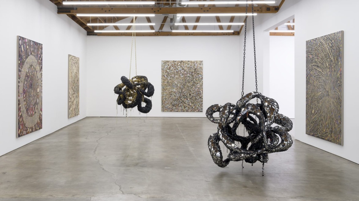 In her third solo show with the gallery—mysteriously titled “Cracked; loosely thru the night visions”—Mindy Shapero explores the material relationship between her enigmatic paintings and goth-like sculptures. Creating what she calls “scribbles in space,” the Los Angeles–based artist’s bricolage sculptures are constructed by bending long rods adorned with broken mirrors and scores of painted found objects into snaking, twisted forms that she either hangs from the ceiling with chains or plops on a plinth.