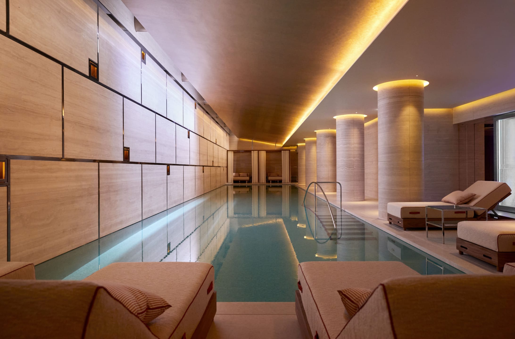 Inside Surrenne Belgravia spa, guests can access rejuvenating amenities including a snow shower, wet and dry saunas, and a 72-foot pool outfitted with underwater music