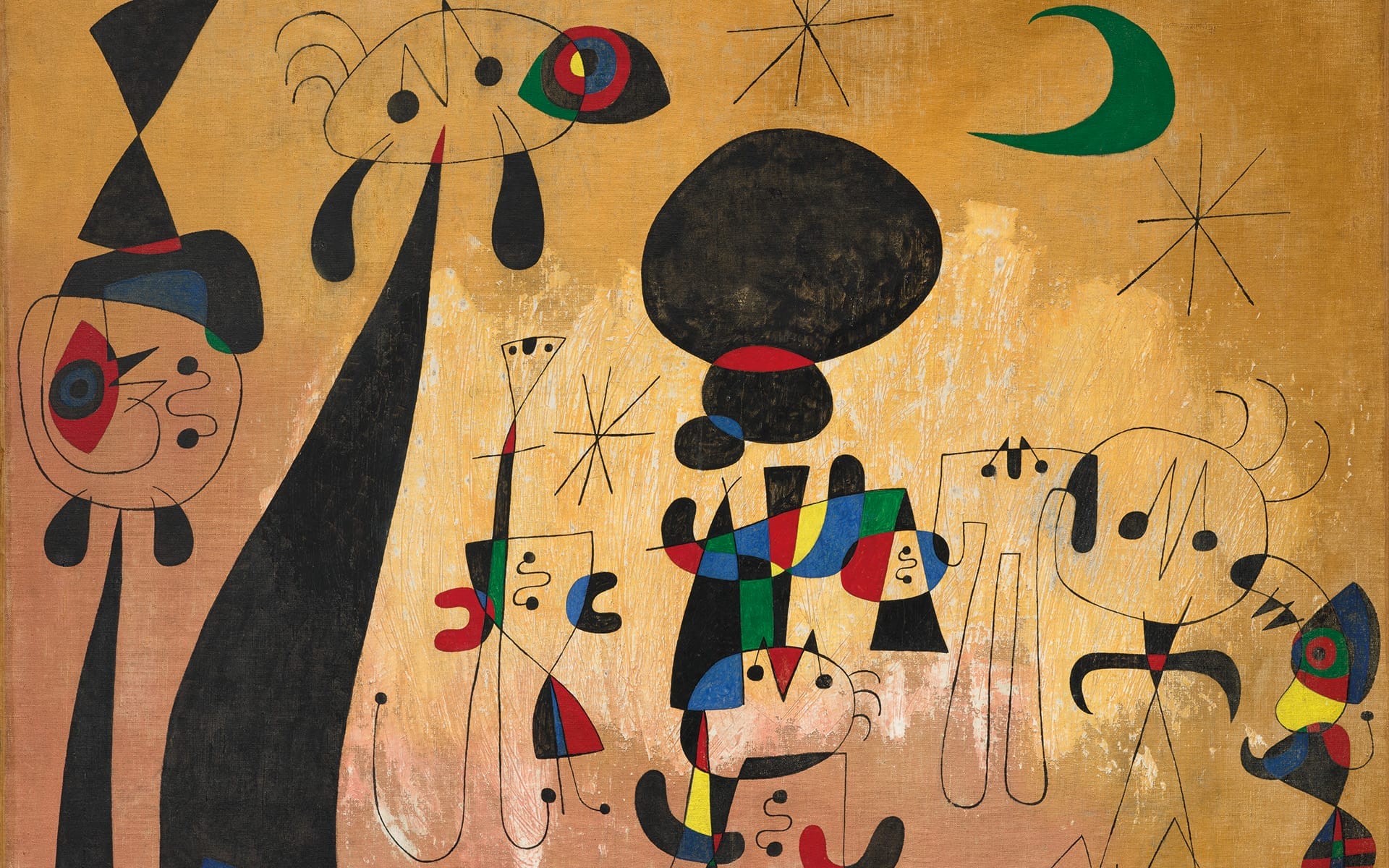 Peinture (Femmes, lune, étoiles) is one of the most paramount examples of the Catalan painter’s art practice, who is renowned for his use of flat planes and minimalism shown through predominately black figurative shapes juxtaposed against splashes of color. “Empty spaces, empty horizons, empty plains— everything bare has always greatly impressed me,” the artist once said. From his Peintures lentes or “Slow Paintings”—a term coined by the art critic Jacques Dupin to describe Miró’s reflective approach to painting between 1949 and 1950, it depicts a group of figures under a starry sky.
