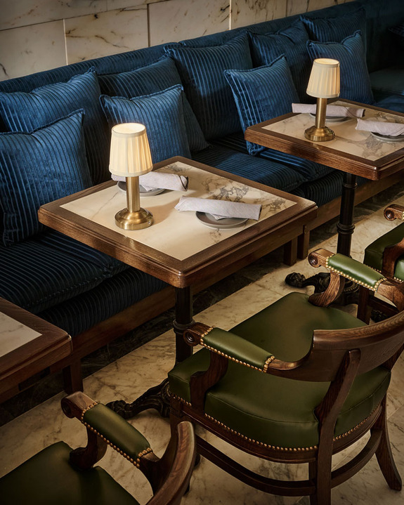 Plush seating vignettes surround the monumental stone bar, which is anchored by the former bank’s original 15,000-pound vault door. Technicolor banquettes in sumptuous materials are executed in a medley of styles, from geometric Art Deco–inspired shapes to a streamlined Danish modern. Lopez conceived and crafted much of the built-in seating himself courtesy of his fabrication company The Project Assassin and incorporated an array of vintage pieces, much of which he reupholstered. “It gives a feeling like the place isn’t brand new,” he says. “It has an old-world sense of charm and familiarity, but also it’s playful.”