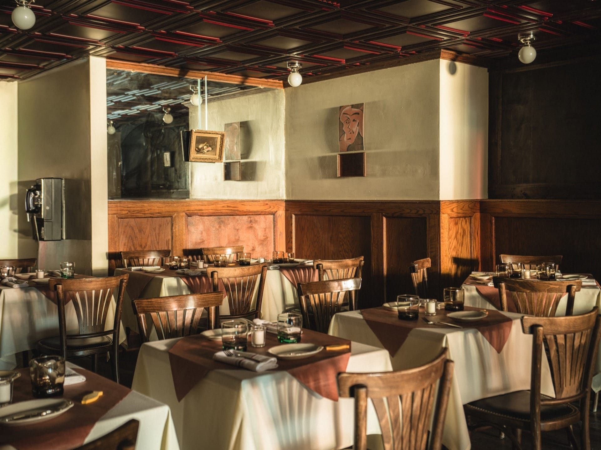 Empty restaurant dining area with neatly arranged tables and chairs, soft lighting, wooden paneling, and framed art on walls.
