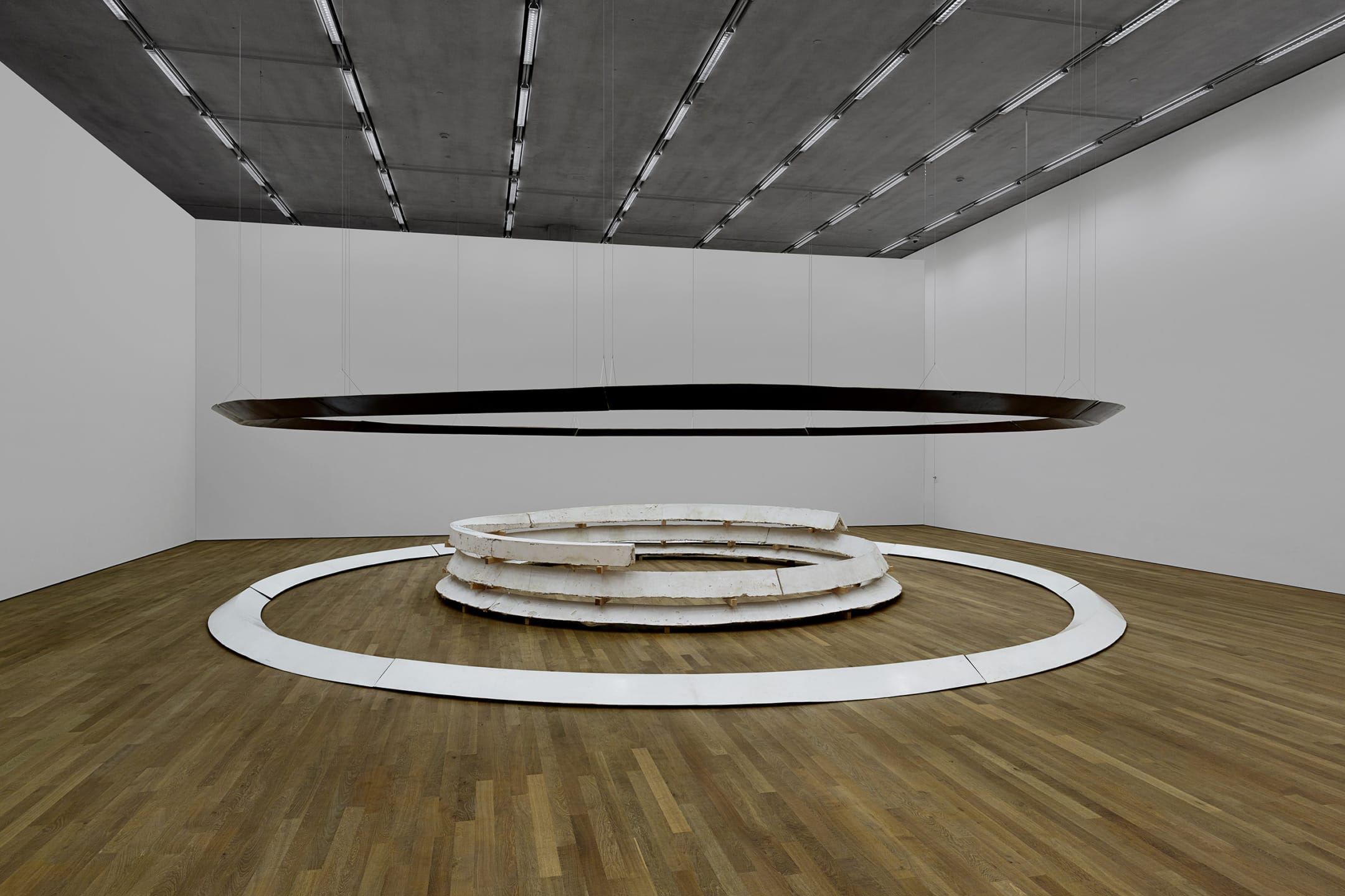 Museum art installation with concentric circular structures, featuring a suspended ring, on a wooden floor with white walls.