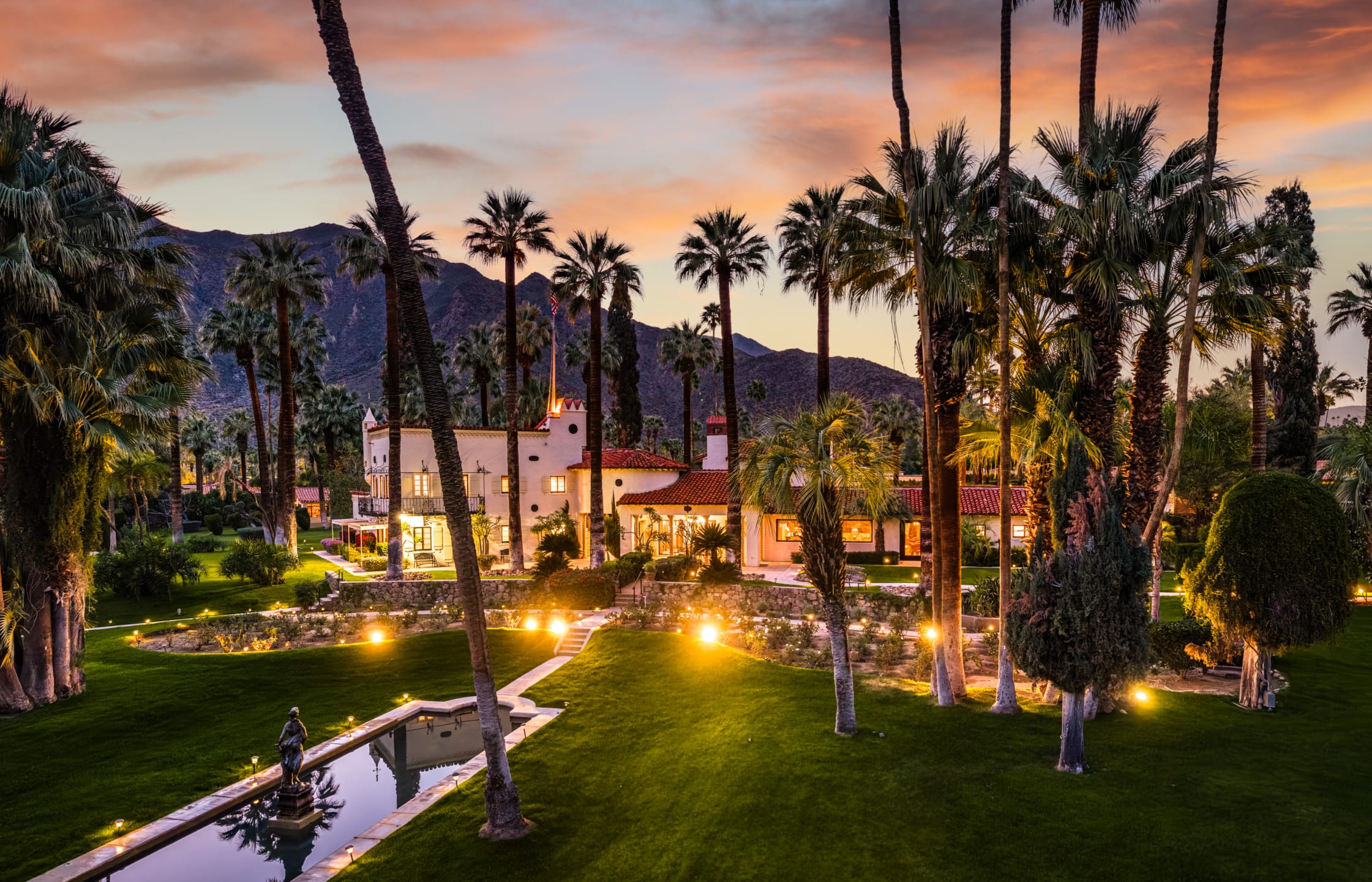 Grant coined the name Villa Paradiso for the circa-1928 enclave. It boasts four separate quarters and is one of the largest private lots in Palm Springs. Design features include hand-painted ceilings, five partial baths, a two-story foyer, and a sculptured outdoor water fountain.