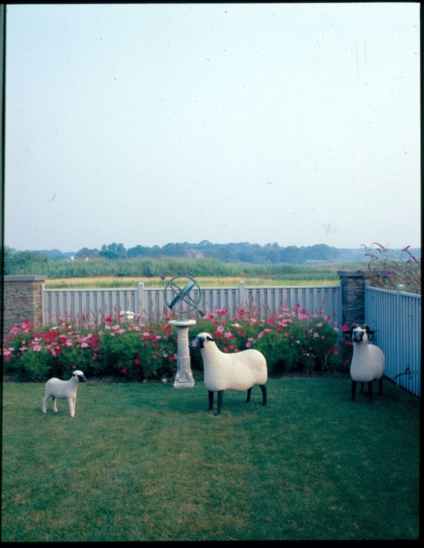 Working from his glamorous Sagaponack library hasn’t stopped the New York–based designer from setting the perfect dinner table or smiling at the Lalanne sheep