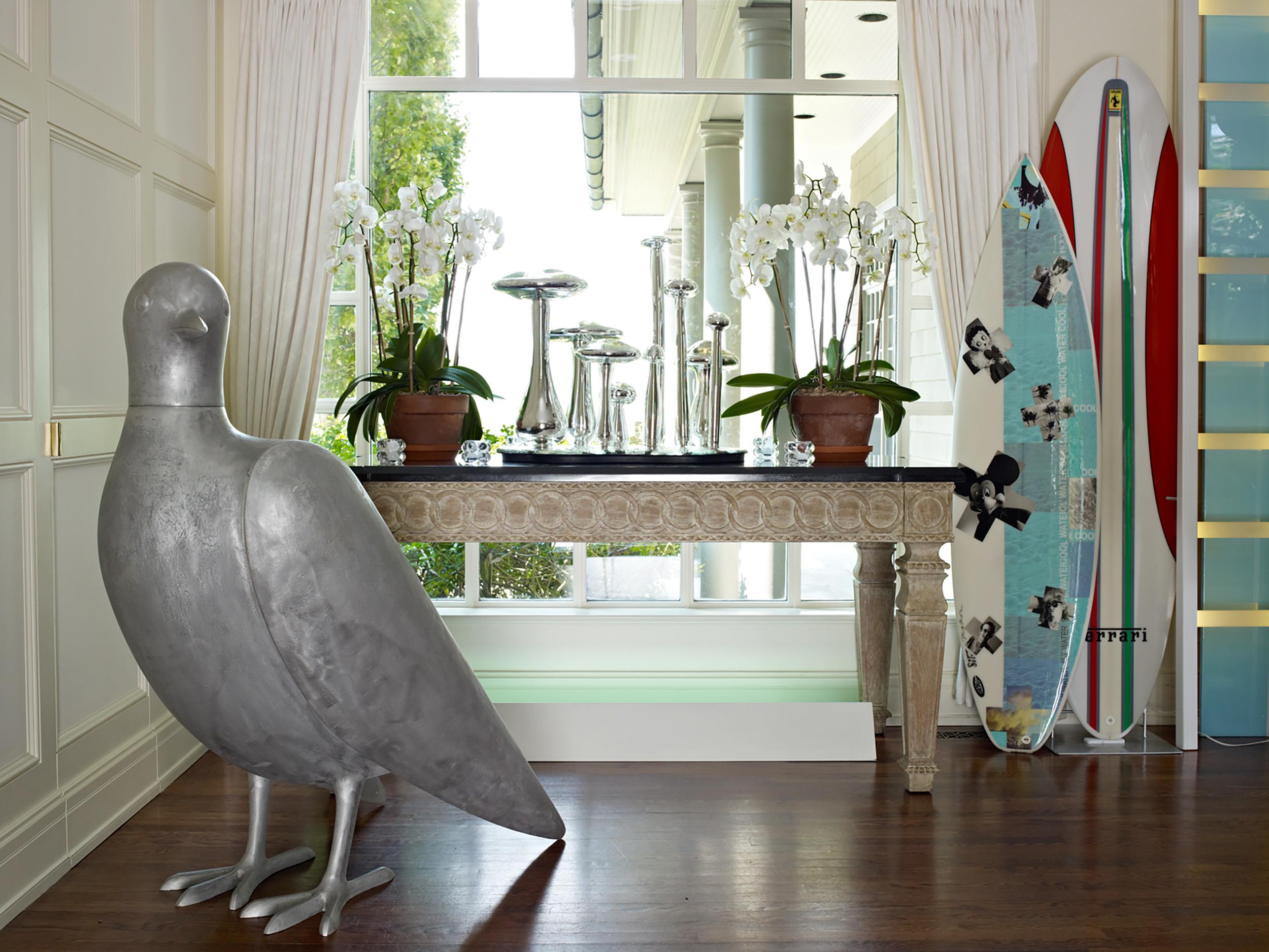 Rob Wynne mushrooms animate a table in the entry hall, which gets a bold splash of color from a collection of art surfboards and a Lalanne bird chair.