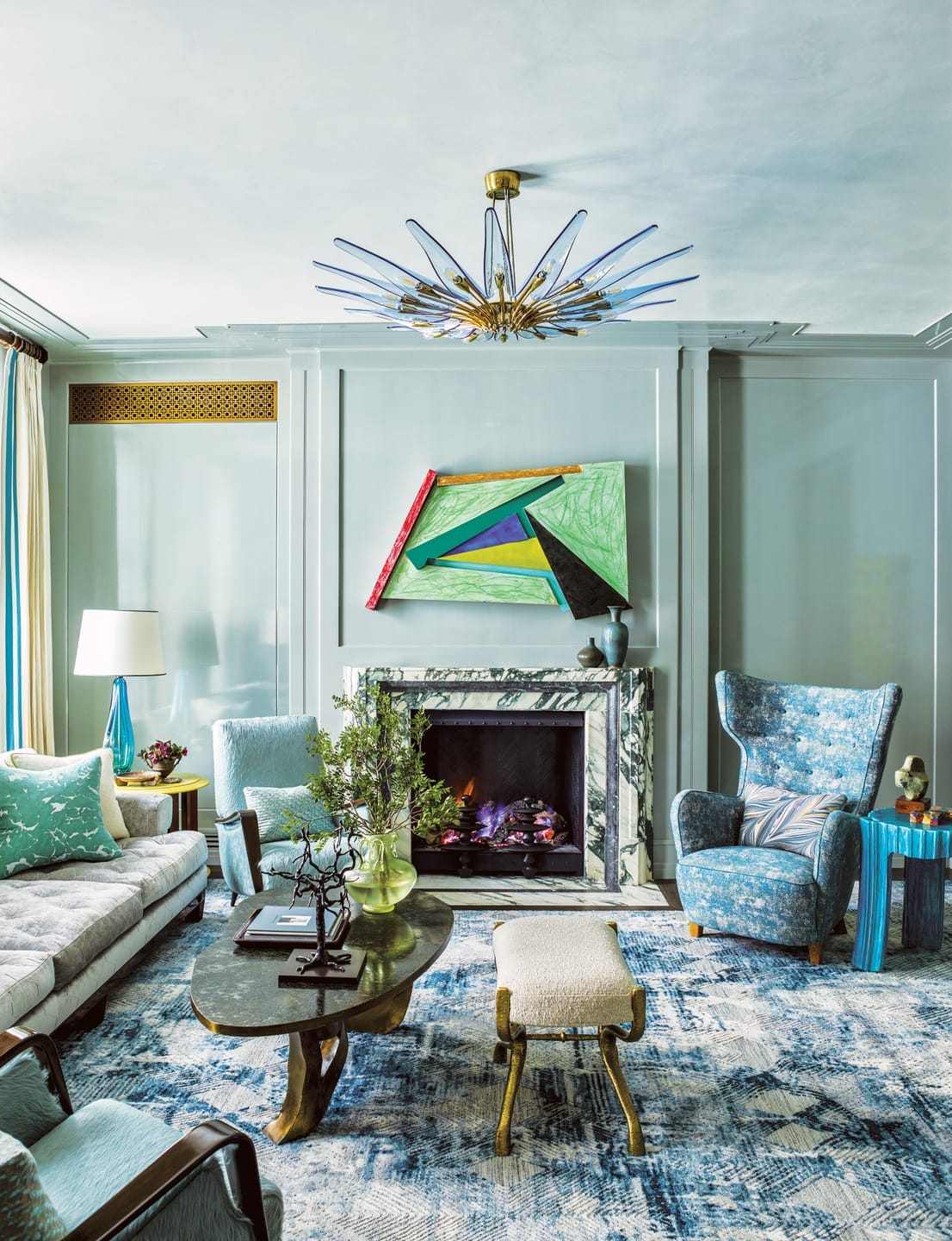 “I wanted the contrast of cool tones and warm tones—silvers and blues at the front of the house and warmer colors as you go deeper inside,” explains Gambrel, who outfitted the spaces throughout with a snappy combination of distinctive vintage and bespoke furnishings. The living room’s electric mix, in a symphony of turquoise blues, features 1950s Italian club chairs in hair-on-hide upholstery, a jewellike Philip and Kelvin LaVerne cocktail table from the ’70s, vintage Murano glass lamps, and a radiant midcentury chandelier by Max Ingrand for FontanaArte.