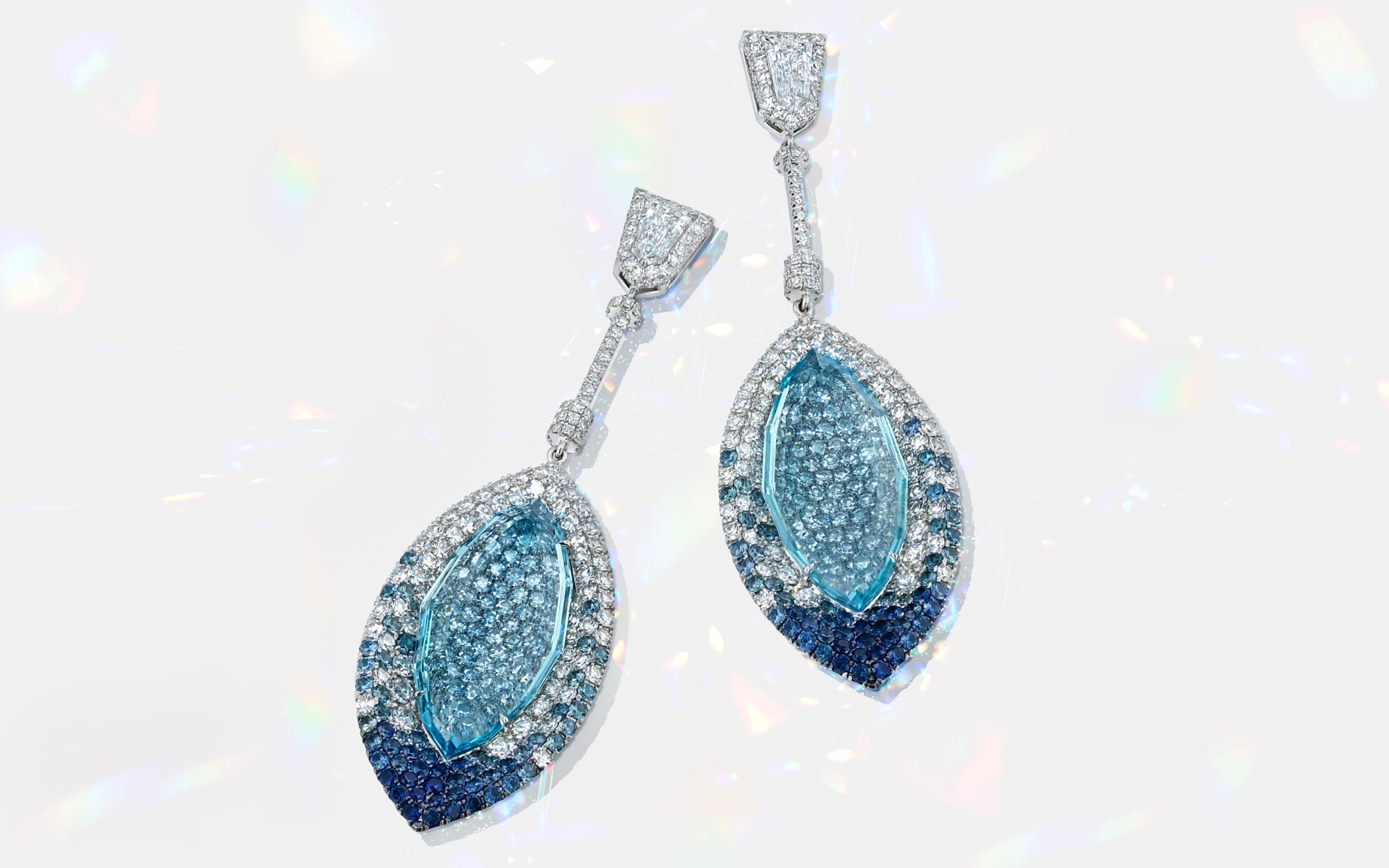 Emerald Cut Aquamarine Earrings: Emerald cut aquamarines accented with epaulette and round diamonds, microset with 474 sapphires and diamonds in 18k white gold.