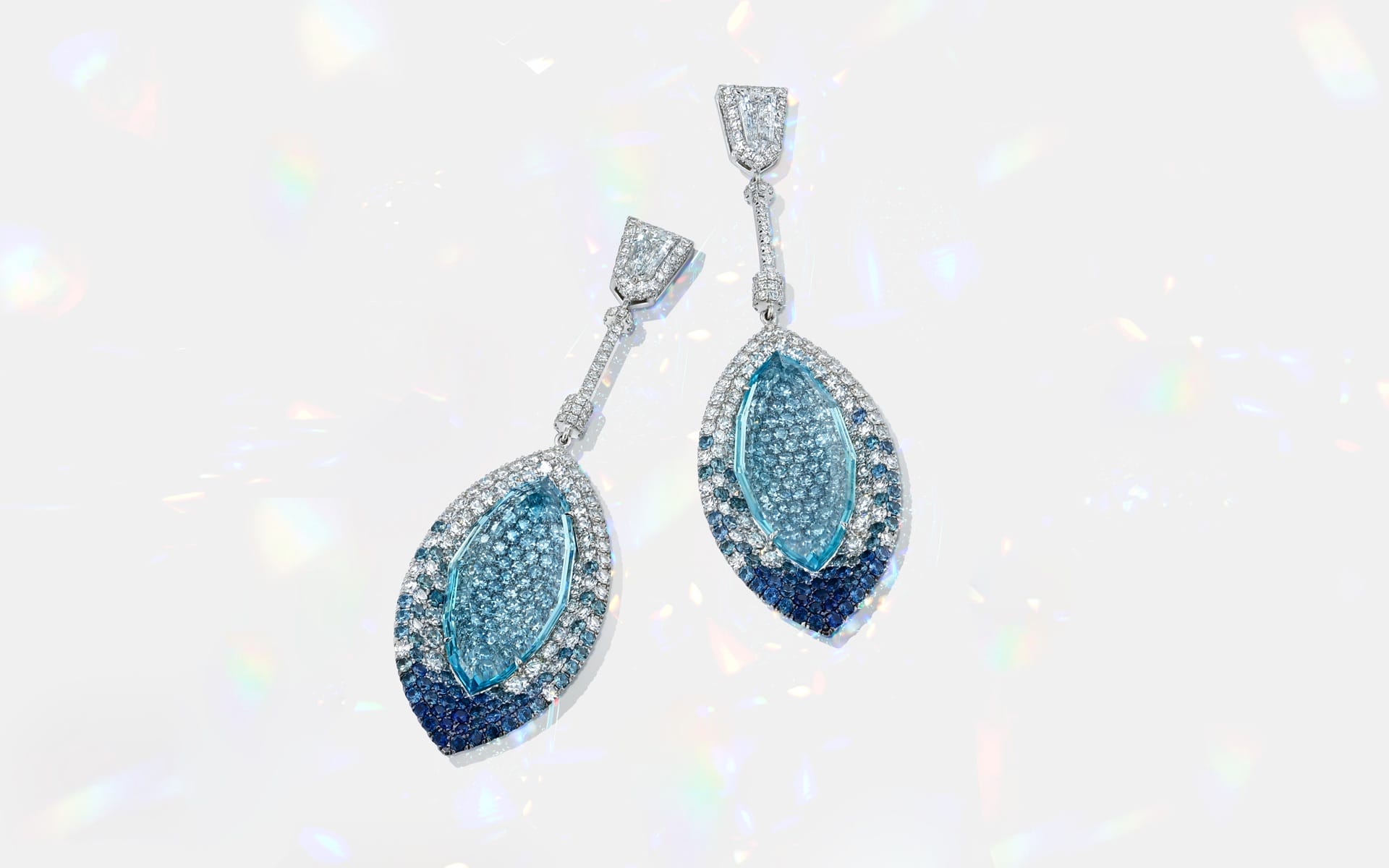 Emerald cut aquamarines accented with epaulette and round diamonds, microset with 474 sapphires and diamonds in 18k white gold.