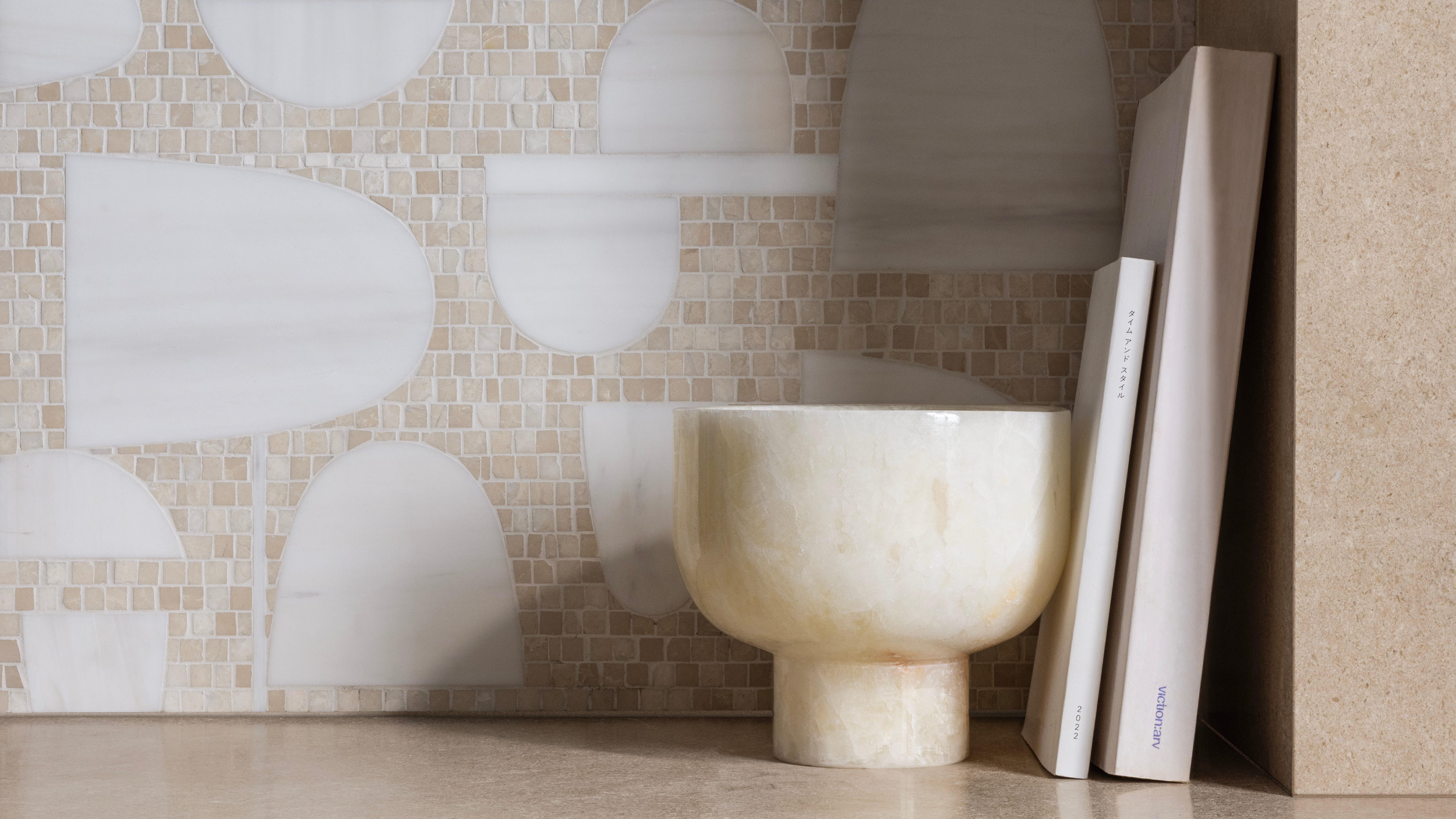 Artistic Tile’s signature Decadence pattern in Cream features Bianco Dolomiti and White Sand Marble in a whimsical design that highlights abstract demi-spheres amid a backdrop of multicolored mosaic tiles.