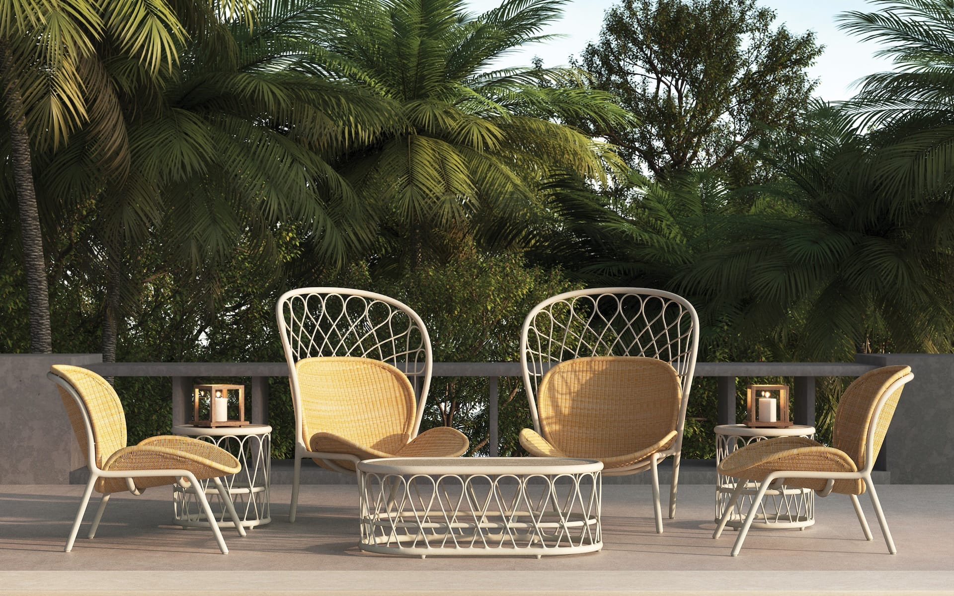 The plume of a peacock and a clamshell’s quiet strength inspired the strong character of Patrick Norguet’s Plume outdoor seating collection, which layers artisanal weaving of weather-resistant polycarbonate over graceful powder-coated aluminum frames. The two low-slung lounge chairs are offered in two dual-toned colorways, while the high-back chair is a particular eye-catcher with its winged, fan build.