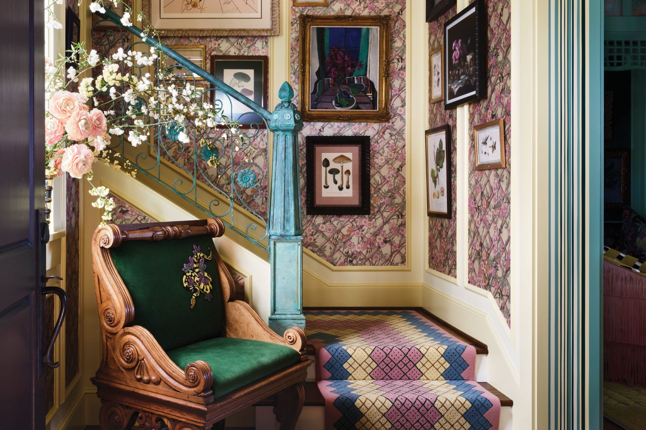 Fulk’s in-house advisory worked with the clients to source pieces that speak to their shared affinity for the outdoors, complementing nature-inspired design flourishes: a verdigris newel post crowned with sculpted blooms, a runner echoing the wallpaper’s trellis motif, and a hand-embroidered vintage chair.
