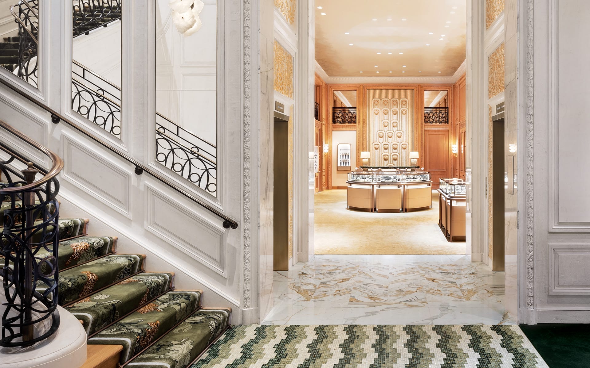In Paris, at 13 rue de la Paix, the renovation was far more intensive, with three design teams—Moinard Bétaille, Studioparisien, and Gonzalez—contributing to the comprehensive 16-month transformation of the space, which has been Cartier’s main home in the city since 1899. Aside from the distinctive black marble façade and a handful of historical elements, everything has been reimagined. Moinard Bétaille, which has worked with Cartier for over 20 years, designing 180 boutiques, took the leading role and cut open the core of the building to create a magnificent atrium anchored by a monumental carved plaster wall of vines that gesture to the brand’s Tutti Frutti motif. “There are some elements that you see during the first visit that are obvious, and there are some others that are more subtle that you will notice only when you come back,” the firm’s founder and president, Bruno Moinard, observes.