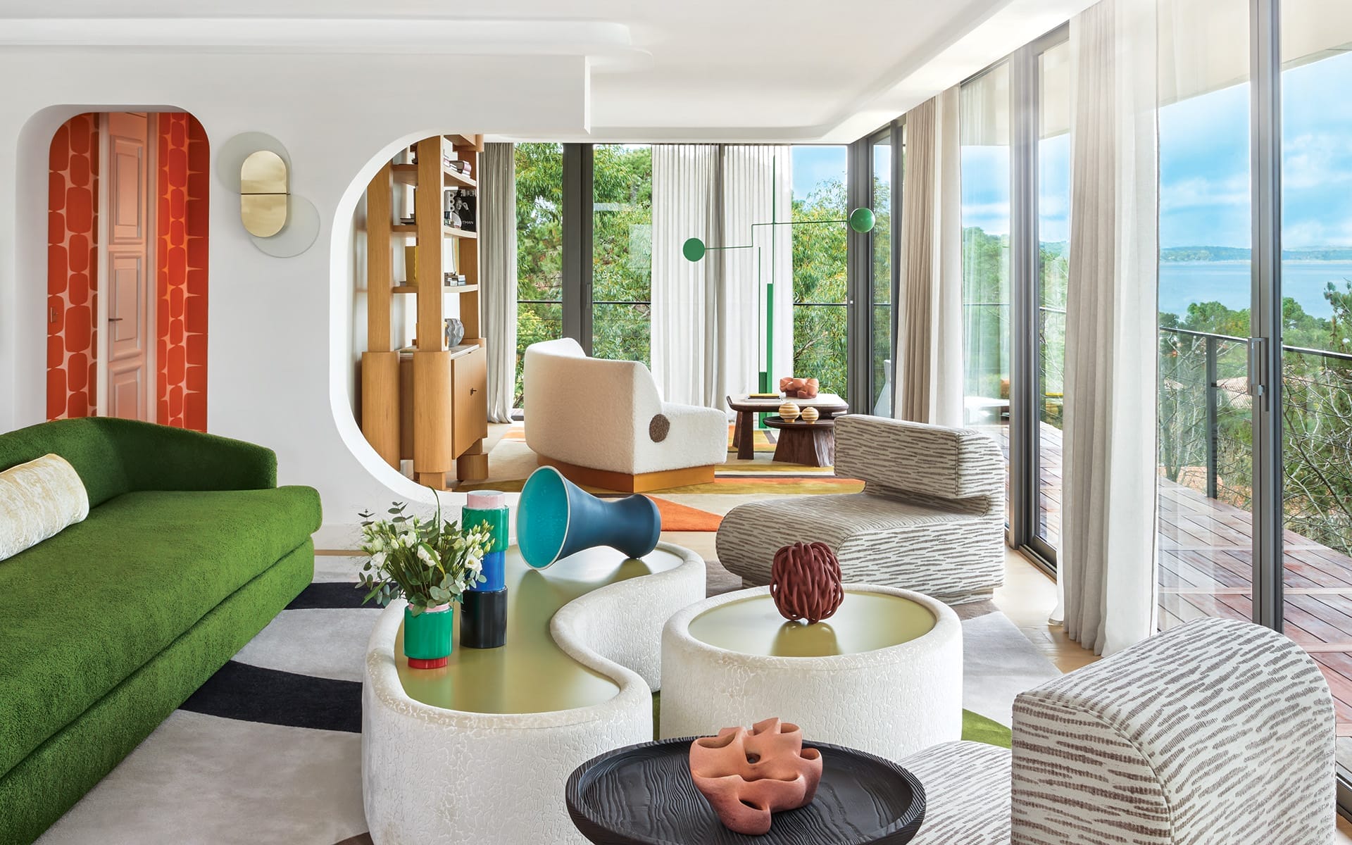 In the living room of a home perched among the cliffs of Cap Ferret, France, designer Fabrice Juan mixes colorful tabletop sculptures by Marc Uzan (left) and Julie Bergeron with breathtaking views.