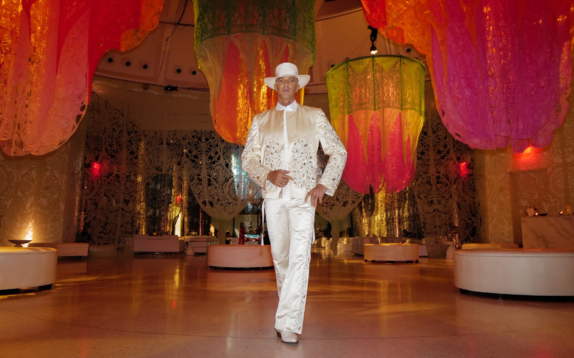 From there, guests—including Swizz Beatz, Timbaland, Note Marcato, Dayssi and Paul Kanavos, Maria Buccellai, Michele Oka Doner, and Rachel Lee Hovnanian—continued through the Rem Koolhaas–designed space to another floor, which had been transformed into dazzling art installation by Manuel Ameztoy. Known for his elaborate site-specific works, the Argentinian artist festooned the room with towering paper cutouts hanging from the soaring ceilings. Recalling Day of the Dead decorations, the paper creations surrounded the room and added to the celebratory feel of the evening as did performances by Lady Bunny and Mia Moretti and Margot of the Dolls.