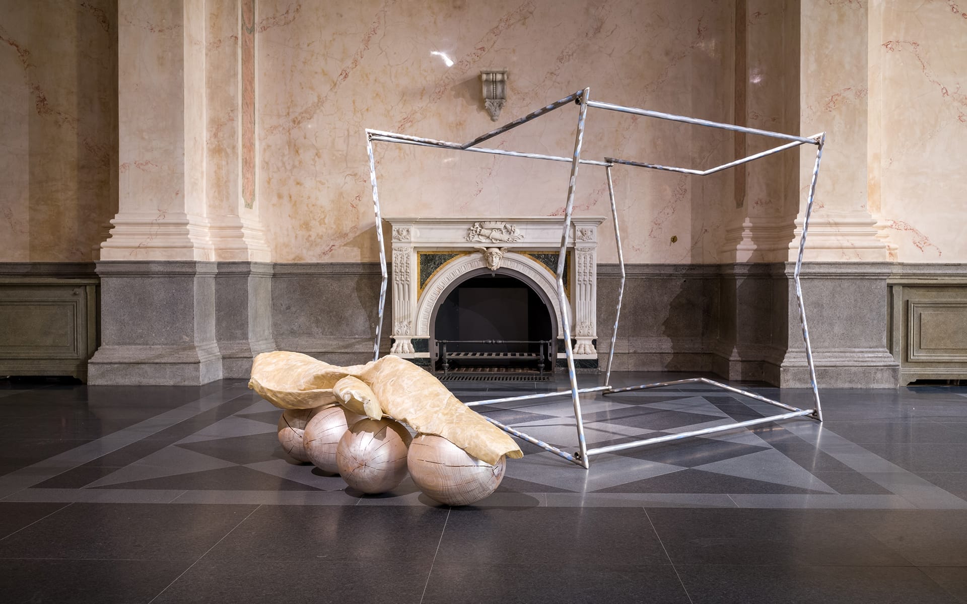 Contemporary art installation with geometric metal frame and organic forms in a classic interior setting.