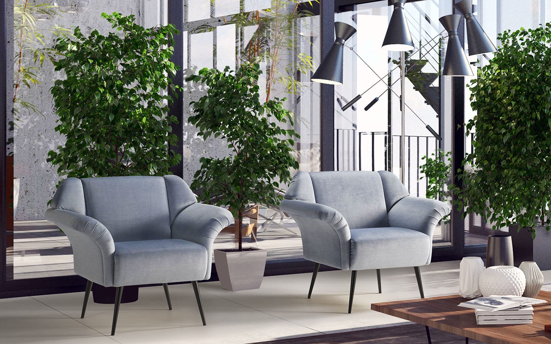 Cosulich Interiors Italian Mid-Century Modern Style Pair of Aquamarine ArmchairsnExquisite Italian craftsmanship at its best, this pair of armchairs, entirely made by hand, embodies comfort. The open design allows for total relaxation, with legs over the armrest. This is elegant and contemporary creation is exclusive to Cosulich Interiors & Antiques, and there are options for velvet colors, leather, different fabrics, and leg lacquer color.