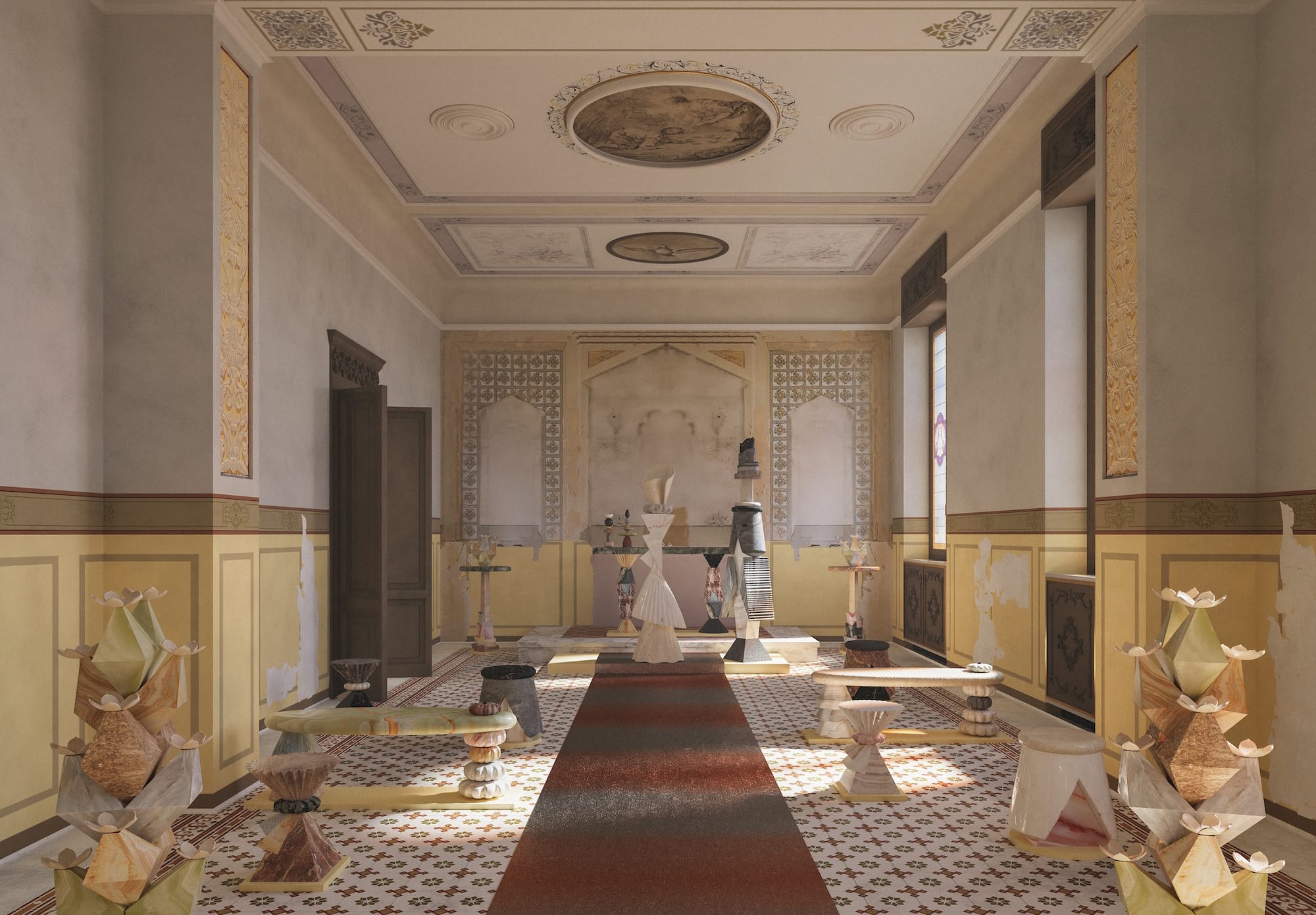 At both sites, the dialogue between early 20th-century architecture with avant-garde design will undoubtedly spark memorable encounters. One will come courtesy of Andrea Claire, who is presenting a totemic array of gilded luminaires wrapped in hanji, a traditional Korean mulberry paper, stacked into vertical compositions on slender brass armatures. Kiki Goti is debuting carved marble furnishings developed with Marble Sachanas in Thessaloniki, evoking the draped surfaces found on ancient Greek statues of female figures. Studio Lugo will reveal one-off pieces fashioned from peeled-back and blossoming layers of alpaca metal, also known as German silver, whose exposed construction and reflective surfaces lend jewelry-like presence. Sten Studio, meanwhile, is staging a wedding of eye-catching stone totems—complete with an abstracted bride and groom—in the military hospital’s derelict chapel.