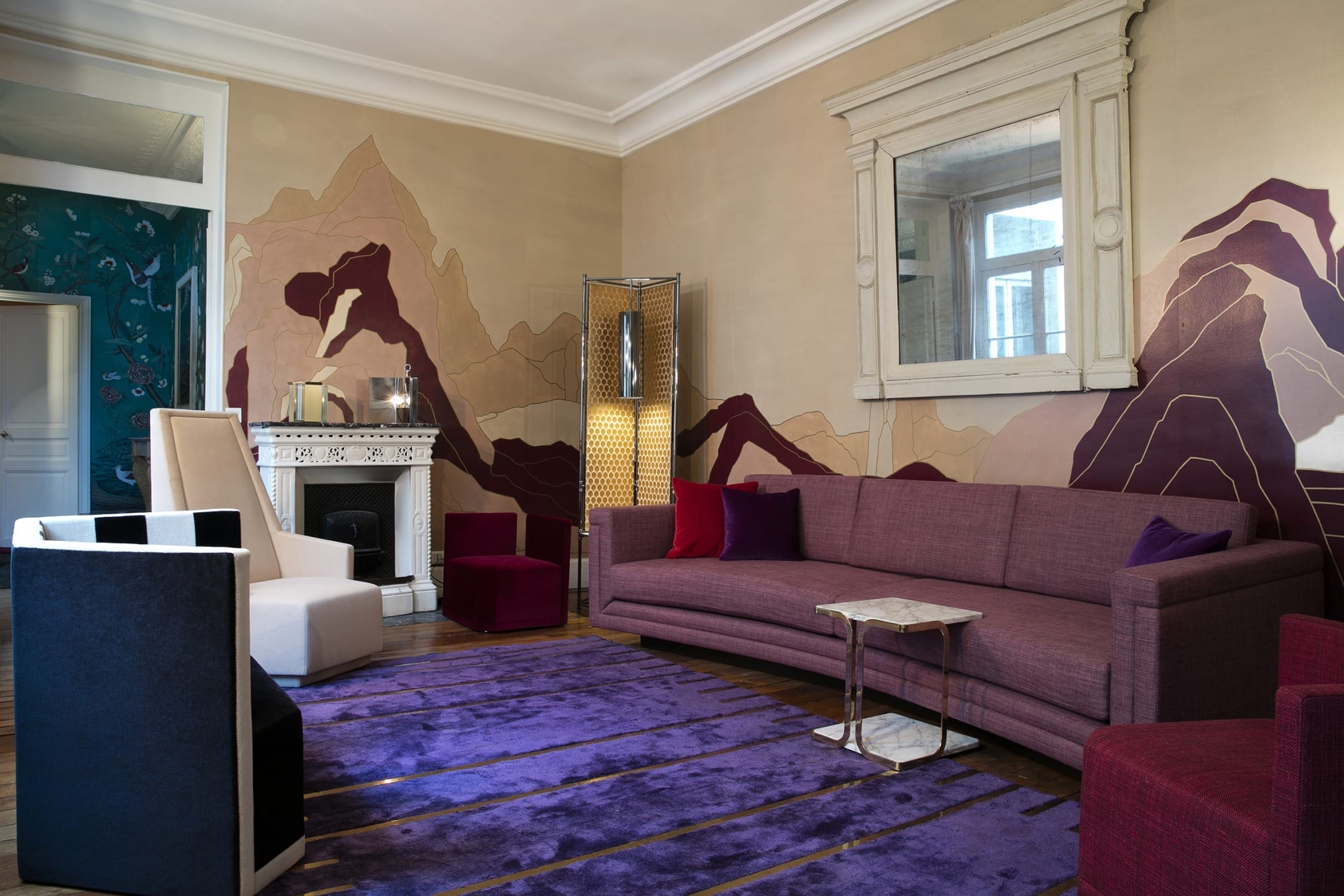 Art deco living room with a purple sofa, modern chairs, mountain mural, and a fireplace, featuring a large wall mirror.