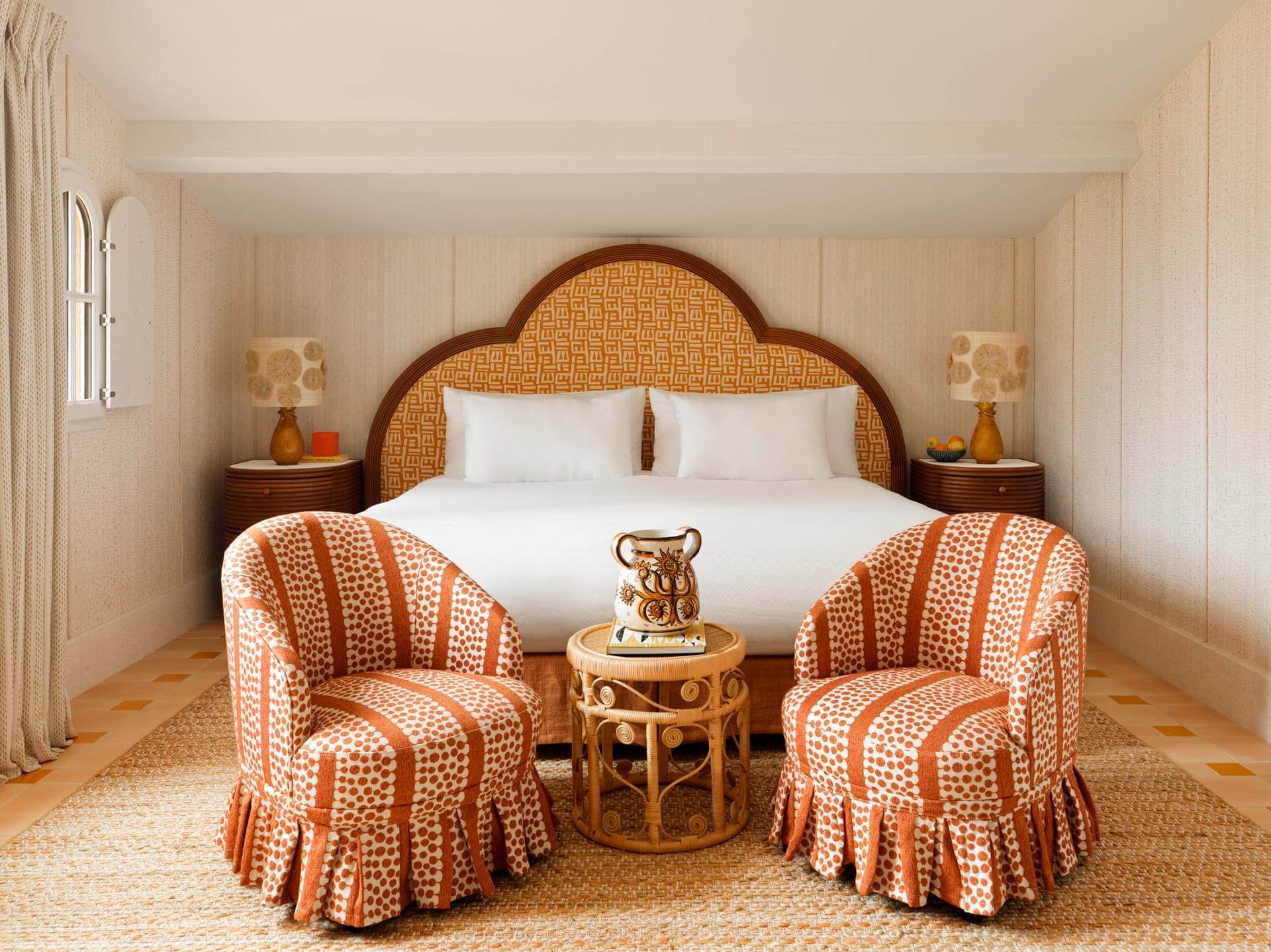 No detail was overlooked in crafting these luxurious yet insouciantly laidback retreats, from iconic vintage pieces and custom ceramic minibars to intricate marquetry wooden doors. Playful layers of pattern and texture, including striped upholstery, inject a sense of whimsy and comfort, while “carefully selected vintage furniture and artisanal decor create a nostalgic 1970s vibe,” the designer notes. “Every curated artwork and intricate tilework enhances the overarching sense of home and relaxation.”