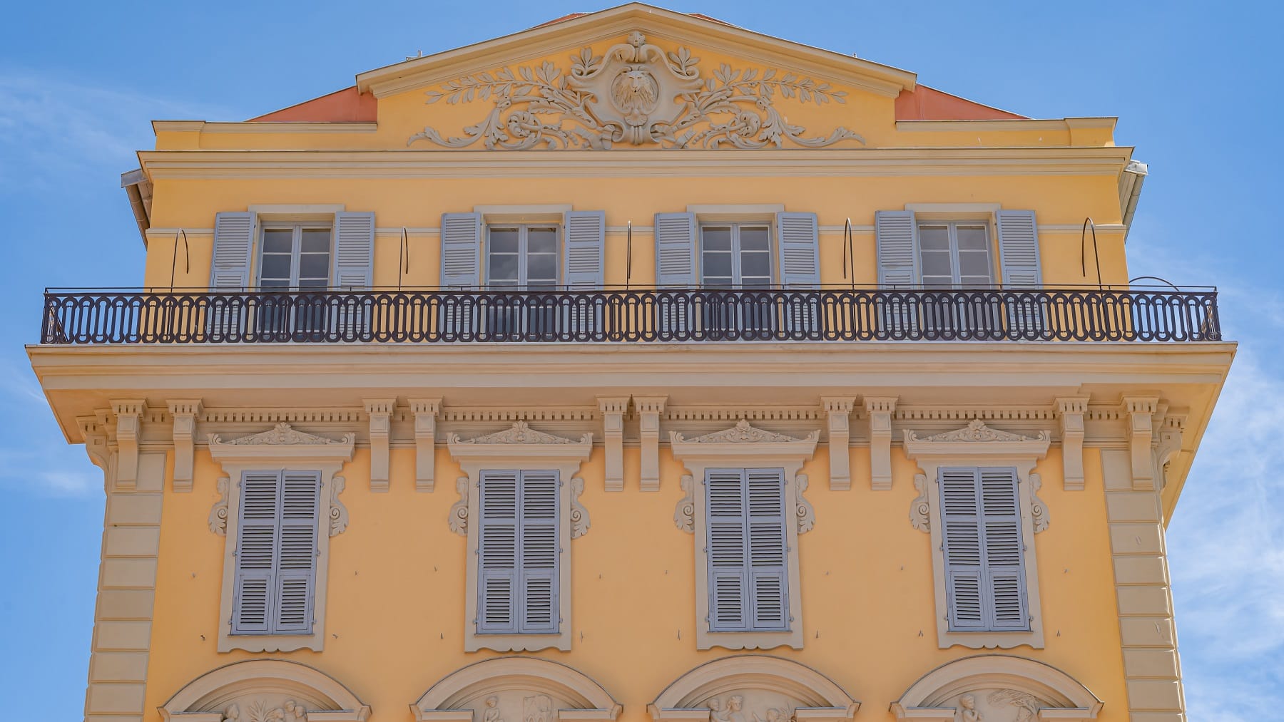 Glimpsed from a café along Nice’s Old Town market on the Cours Saleya—a long rectangle of stalls piled high with fruit, vegetables, and flowers—the Palais Caïs de Pierlas rises at the far end of the square. At certain hours of the day, its golden-yellow façade takes on an uncanny glow against a cobalt sky.