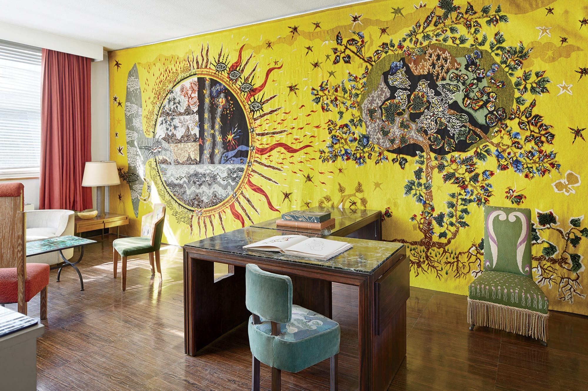 The sitting room of Villa Seurat, the Paris home of Jean Lurçat, features a custom-designed wall covering by Aubusson.