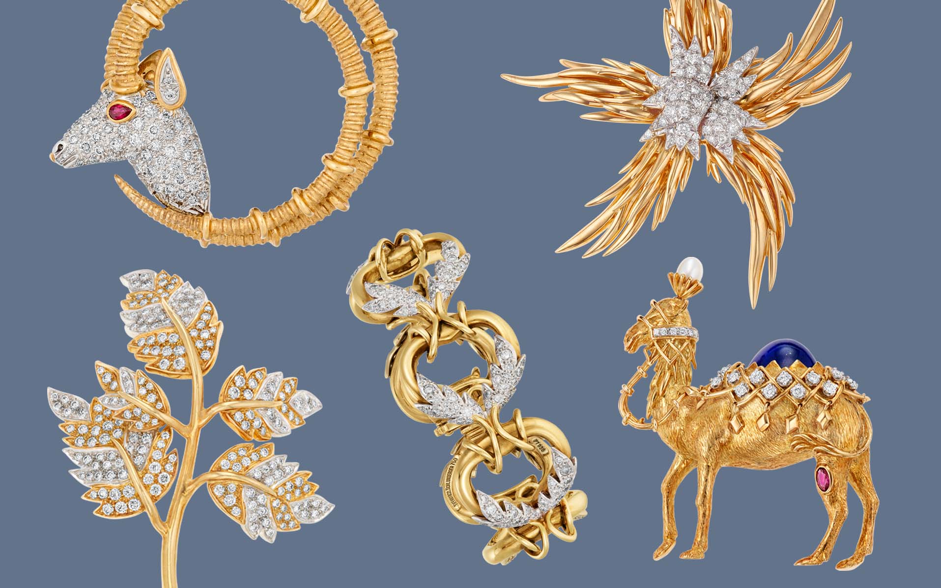 Collection of intricate gold and diamond jewelry shaped like animals and plants on a grey background.