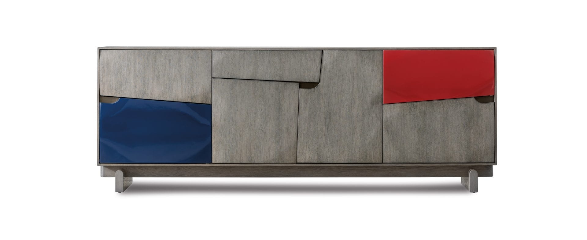 His 16-piece Jiun Ho Collection V is a tangible travelogue. Some of Ho’s most dramatic pieces are the Pisac cabinets, inspired by Ho’s visit to Peru’s Sacred Valley and the small community nestled outside. Ho based the design on the fine incised masonry he saw among the Incan ruins. “They were perfectly cut and stacked, had no grout, and they are still standing,” he marveled. Both the buffet and the night table have precisely fitted, stone-shaped drawers. For accents, he chose vibrant colors inspired, he said, by the bold primary palette of Dutch artist Piet Mondrian. The resulting pieces artfully combine the ancient with the modern, a continuing motif in Ho’s work.