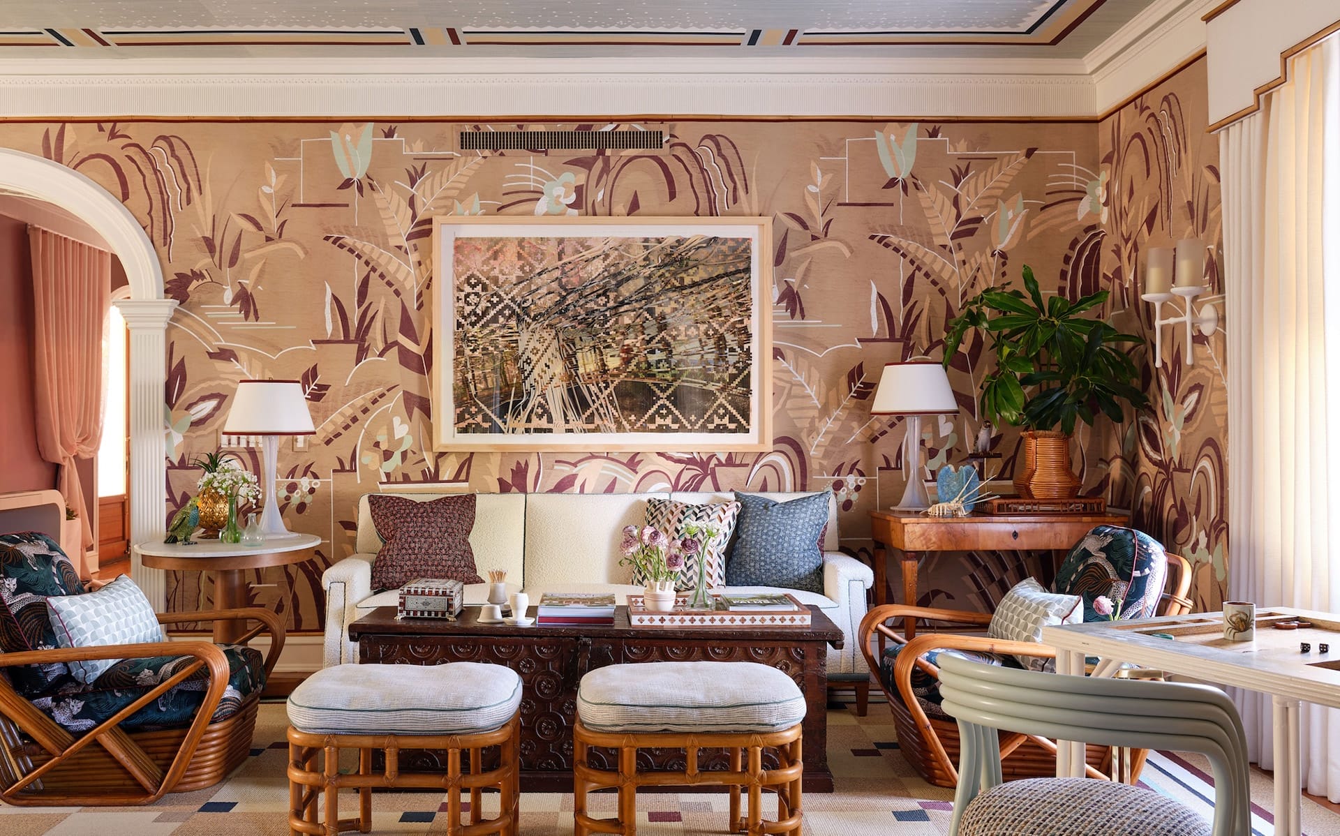 Marshall Watson & Reid Deane Ganes InteriorsnThere are endless options for entertaining in the living room, envisioned as a lavish ode to the golden age of Palm Beach replete with punchy Art Deco influences. Ikselu2019s abstract geometric wallpaper riffs on classic palm patterns, playing off a pair of rattan Bonacina lounge chairs, bamboo trims, and hand-stenciled ceiling motifs by Artful Surfaces that seem to float up the walls. Donu2019t miss a woven photographic work by Sarah Sense that hangs above the sofa; it informed the entire roomu2019s organic palette.u00a0