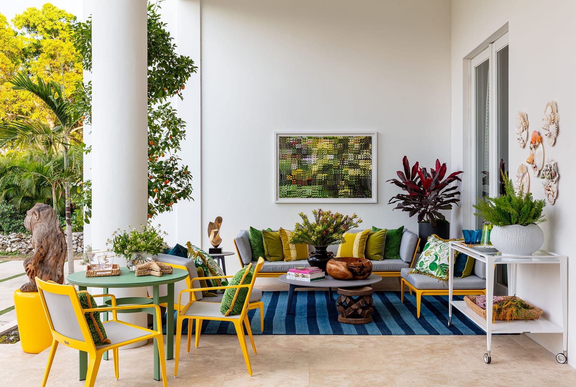 The exterior of the 2024 Kips Bay Decorator Show House Palm Beach got a tropical refresh courtesy of Environment Design Group, the lush plantings adding to the tropical flair Nadia Watts instituted on the front terrace.