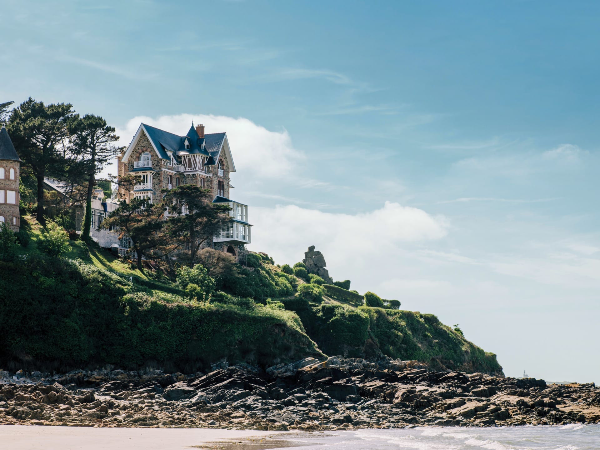 Towering like a lighthouse over Brittany’s romantic, blush-colored shore, the former Manoir du Sphinx hotel has long reigned as the grande dame of the Côte de Granit Rose. Built in the French seaside town of Perros-Guirec in the 1930s, it was one of the first retreats along the water’s edge and adopted the name of its rocky perch. Constructed using local gray and pink granite, with white timber-framed windows and steep slate gabled roofs, the destination echoes the traditional noble homes crowning the Breton coastline.