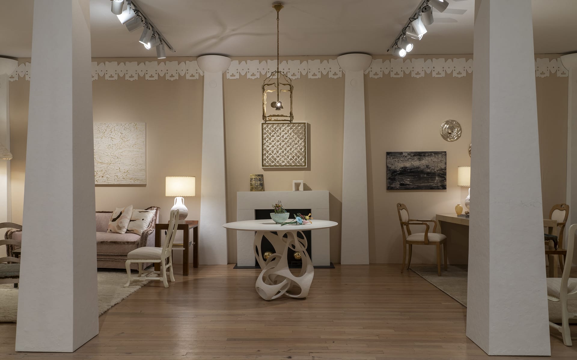 Looking to images of the studios of Brancusi and Giacometti as a jumping off point, McCarthy and Antonson came up with an architectural envelope for the space that would not only provide a framework for the collection of work by artists and artisans O’Brien would present but also to show off the range of Antonson’s ability. Primarily known for his light fixtures, sculptures, and tables, Antonson would create a site-specific fireplace, six pilasters with capitals, and a frieze. “It gives you this dimensionality that you other than just decoration,” explains McCarthy, who worked with Jared Austin from his team.