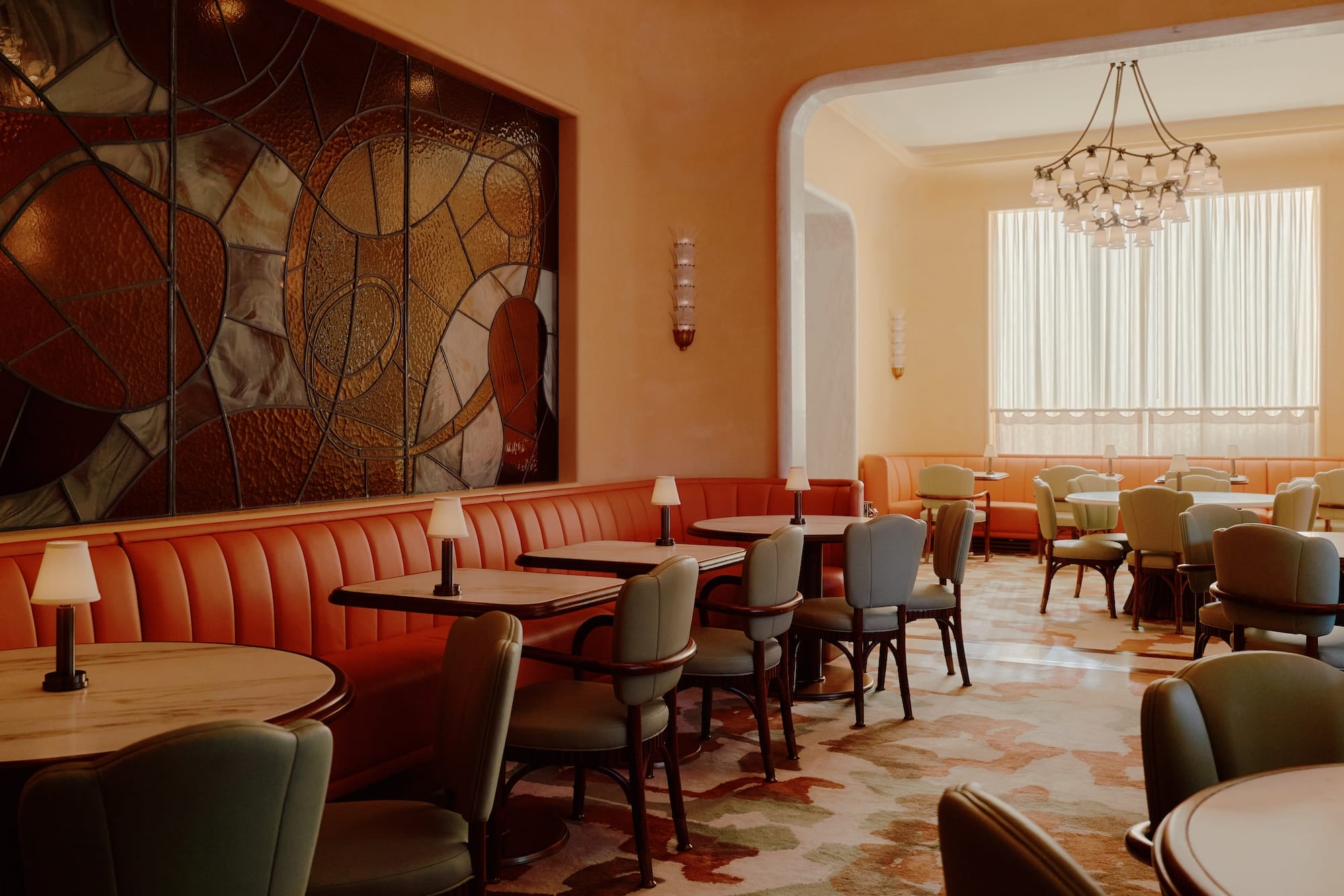 Beyond, O’Sullivan clad the main dining room in peachy Provençal-inspired plaster punctuated by stately marble architraves and stained glass panels that establish gentle thresholds. Furniture and lighting are largely bespoke, from the compact tailored dining chairs and pyrolave tables perched under branching bronze chandeliers affixed with cascades of bell-shaped glass shades. Carpets, also custom, reference a floral motif sourced from a 1960s fabric. “Our bespoke designs were crucial in bridging that gap between old-world influences and the contemporary setting,” O’Sullivan says, citing subtle details like metal rope motifs and ribbed leather banquettes that “subconsciously reference historical precedents.” Select vintage pieces, meanwhile, appear sparingly.