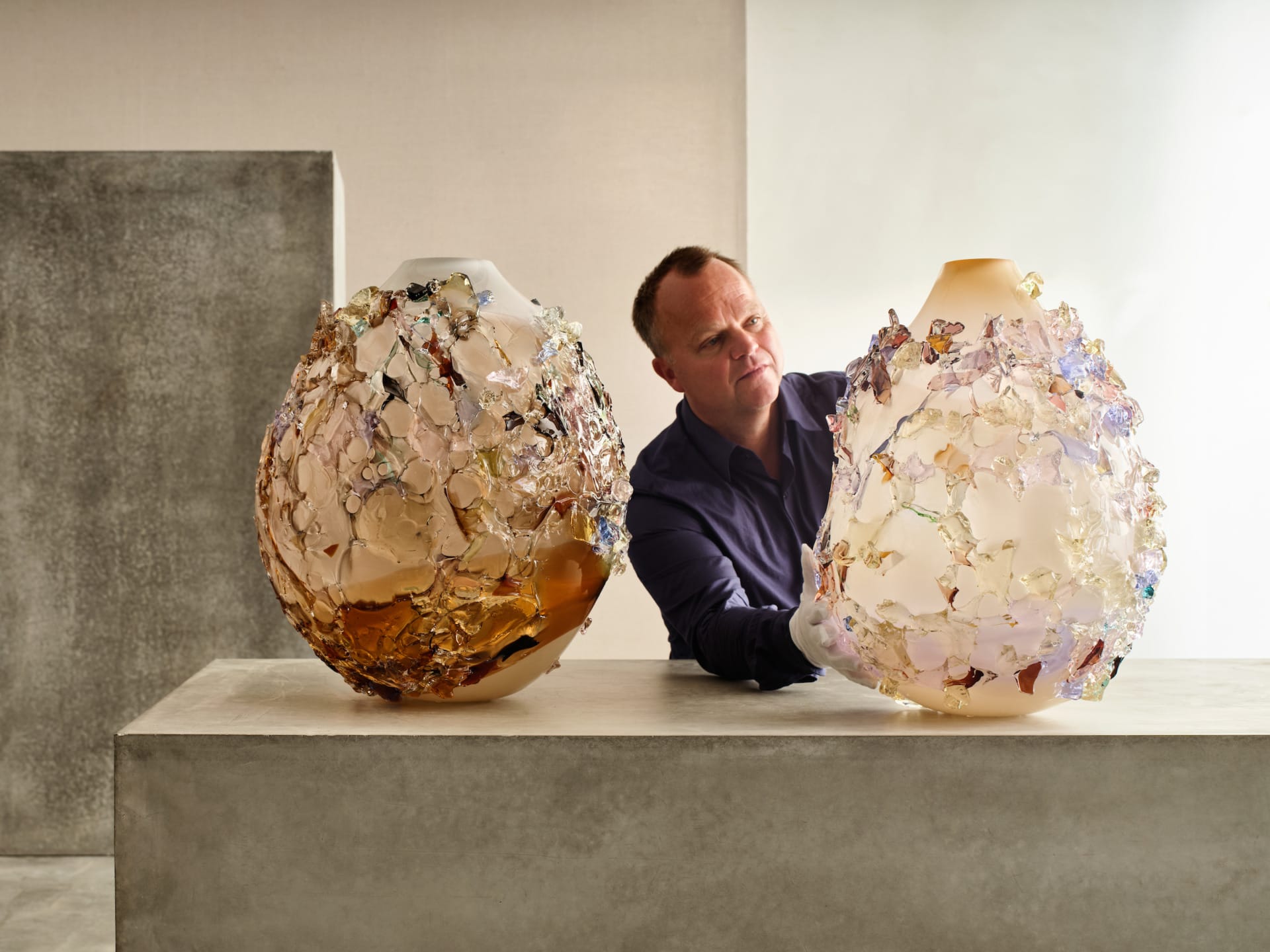He seems to have done that with his luminous, shard-encrusted glass vessels. These oversized glass-on-glass works are, according to the artist, “a fight with the process, a fight with the fire.” Working with a small team, Vrolijk builds each one through a painstaking process of breaking, heating, and fusing glass fragments onto blown forms. It requires a precise alignment of temperature and timing. “I am bleeding when I work on it,” he says. “But in the process, because of the heat and the fire, all those sharp elements become smooth and they look like diamonds. It was a ‘wow!’ the first time I did it.”