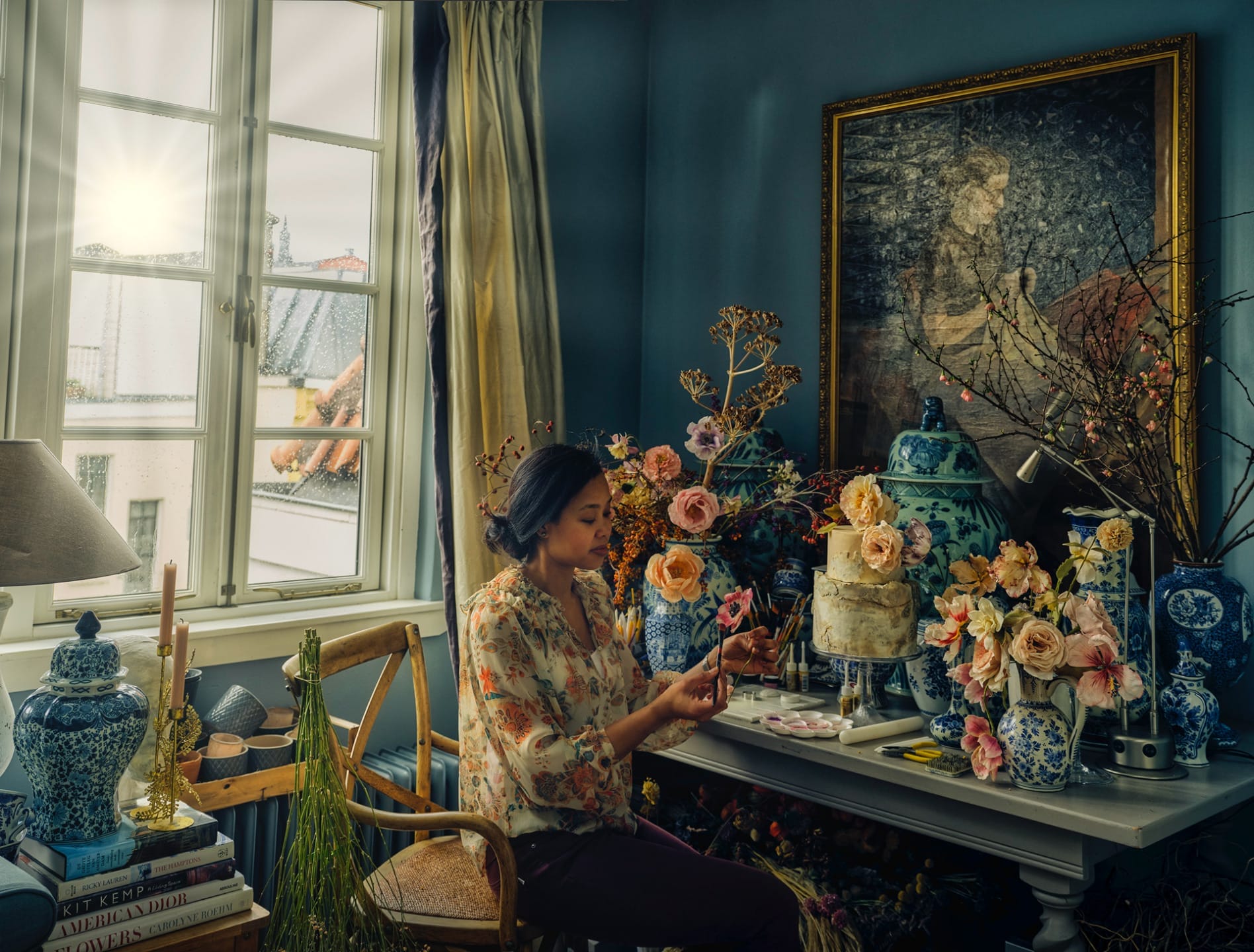 Those lucky enough to be traveling through The Netherlands’ capital city can partake in a private masterclass at Sadi’s home, while others glean her wisdom from her monograph, A Sweet Floral Life: Romantic Arrangements for Fresh and Sugar Flowers (Ten Speed Press). In its pages, she reveals everything from photography tips to sponge cake recipes, step-by-step tutorials for making sugared cherry blossoms and bulbous tulips, along with her abiding love of Dutch Delftware vases.