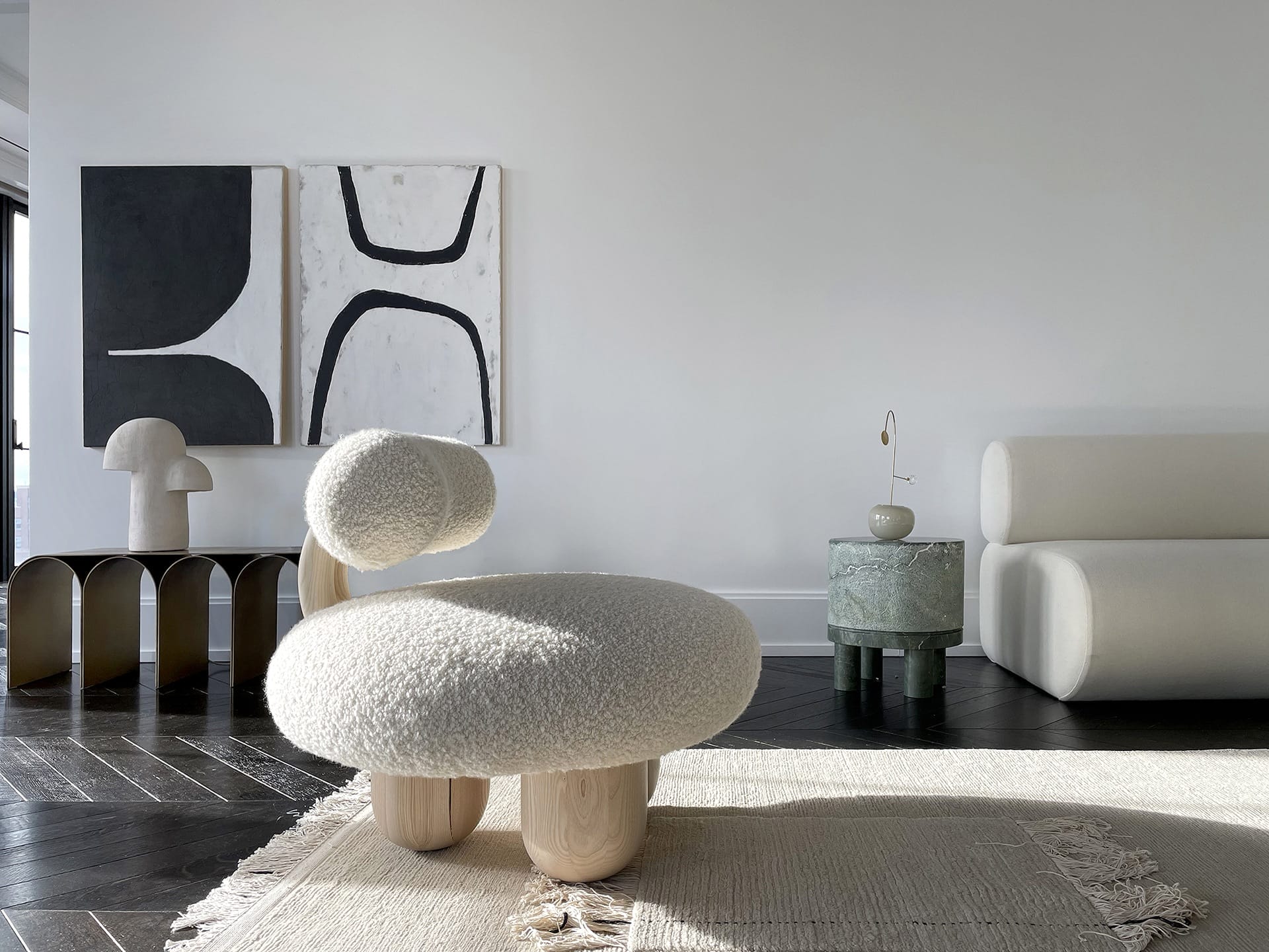 Transportive works of 21st-century European design have been installed in a beautiful apartment in Chelsea’s Walker Tower. Peppered throughout the light-filled loft are works being shown for the first time in America by French designers Elisa Uberti, Frédéric Saulou, and Jérôme Pereira; Germany’s Jojo Corväiá, and Lucas Morten of Sweden, among others. Curated by architect and designer Pietro Francheschini, this debut presentation of Galerie Philia’s roster was cultivated to “establish a dialogue between the Art Deco architecture of the building, the omnipresent skyline, and the collectible art and design pieces.”