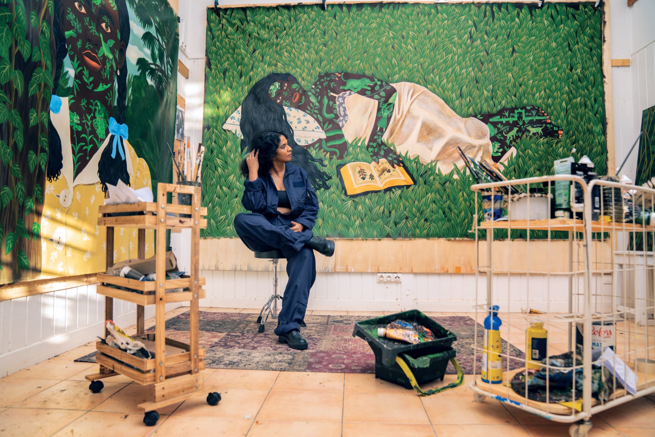 There are many tales to be told in the rich works of Kelly Sinnapah Mary. With a practice spanning painting, sculpture, and installation, the Guadeloupe-based artist pulls from a tapestry of folklore, literature, history, and nature to create vibrant, imagined worlds that challenge the ongoing constructs of colonialism. “My work explores narratives in which the intimate and the collective respond to one another,” says Sinnapah Mary, who has exhibited at the Pérez Art Museum Miami; the 34th Bienal de São Paulo, Brazil; and most recently at a James Cohan gallery pop-up in Paris. “I am deeply interested in heritage and memory, particularly the history of my ancestors, who were indentured laborers from India. I seek to reactivate their traces, protecting ancestral knowledge and constructing an intimate, family mythology that connects to a collective memory that is often obscured,” she explains.