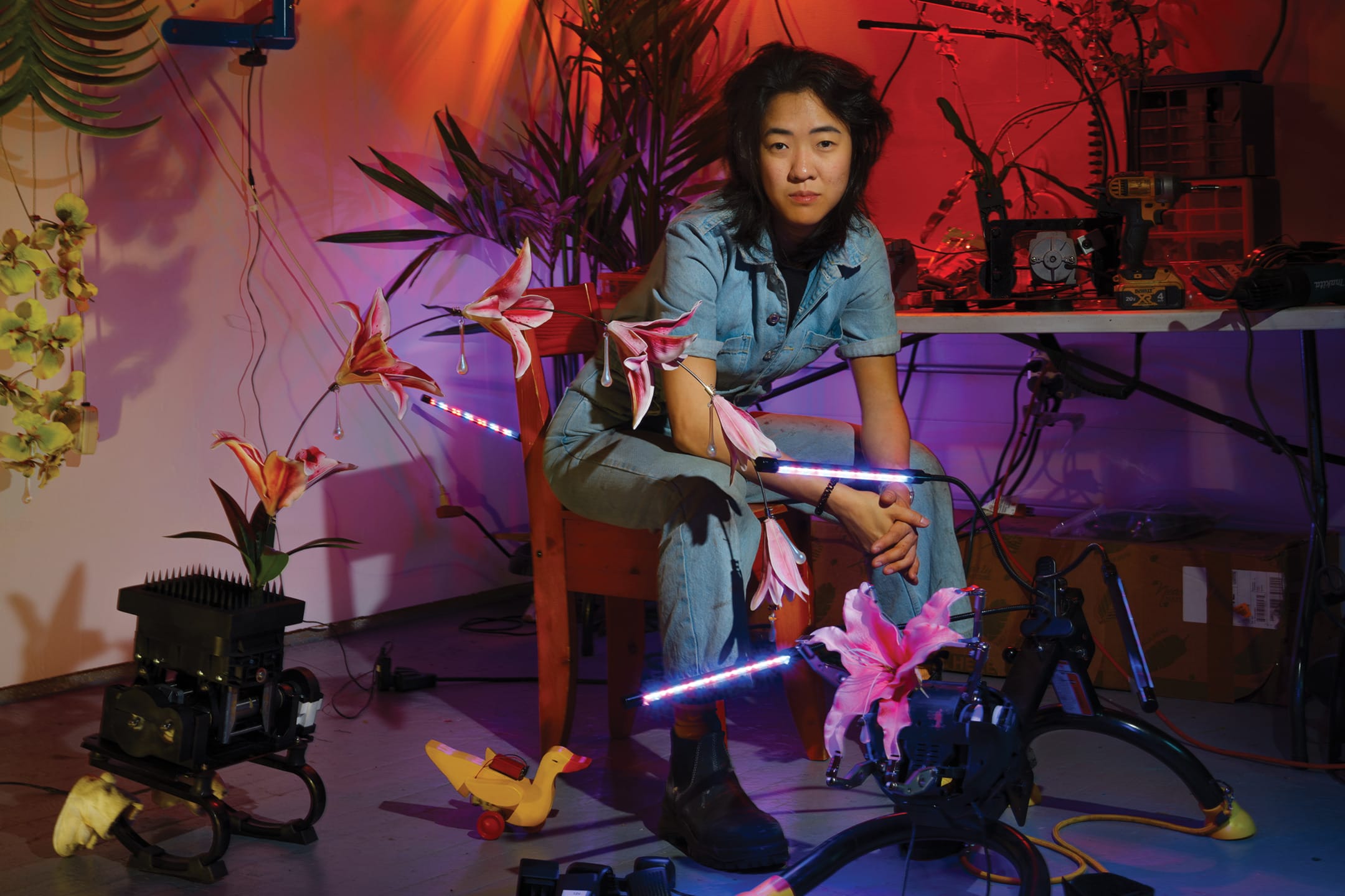 Person seated among colorful flowers and neon lights in an artistic setting.
