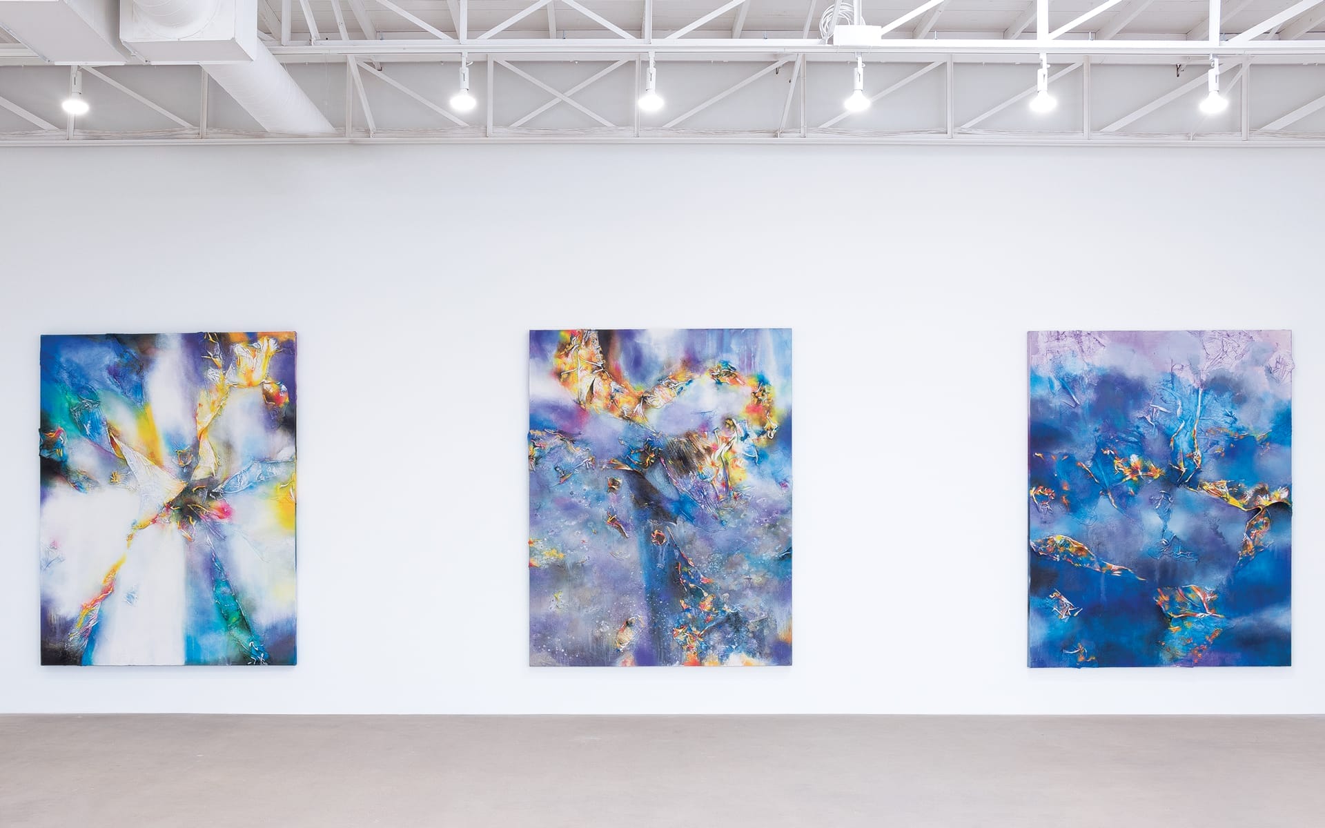 Leslie Martinez’s paintings explode with color and capture elements of light, air, and liquid through a rigorous process of adding unexpected materials to the canvas, creating otherworldly textures. By obfuscating the very nature of the compositions, each work becomes an image-based illusion that “explores the connections between queerness and borders.”