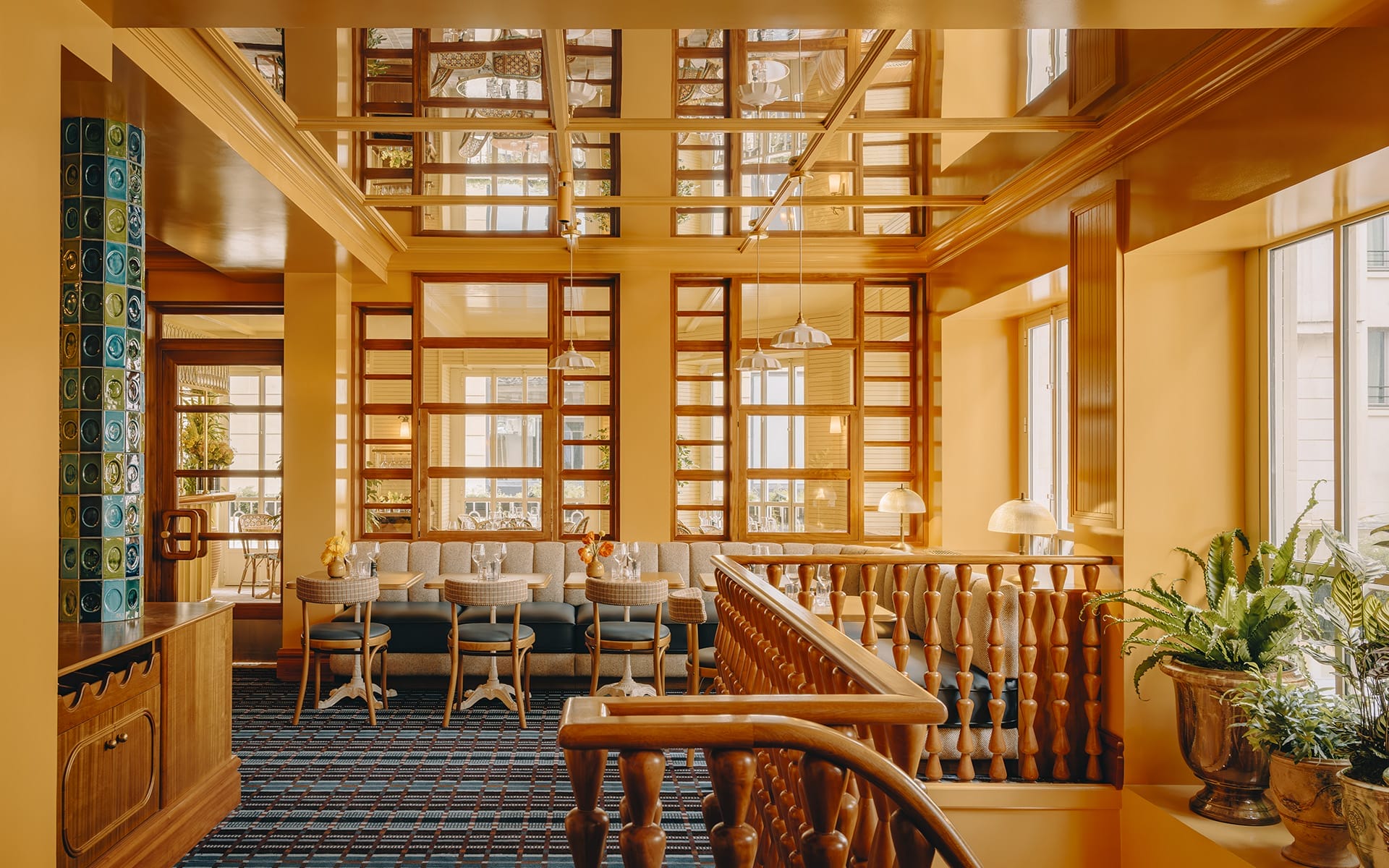 Spilling onto the interior courtyard’s terrace and patio, the eatery is industrial-chic in style, with geometric wooden furniture by Danish design brand Frama, mood lamps by Marset, and counter seats facing the glass-encased open kitchen. Self-taught chef Coupeau’s weekly changing menu pays homage to the scents and recipes of his childhood with recipes inspired by his restaurateur parents and Vietnamese grandparents. Expect playful, dressed-up dishes with unexpected twists, like gamjajeon (Korean potato pancakes) with tarama, crispy chili, and parmesan and cacio e pepe–style macaroni and cheese.