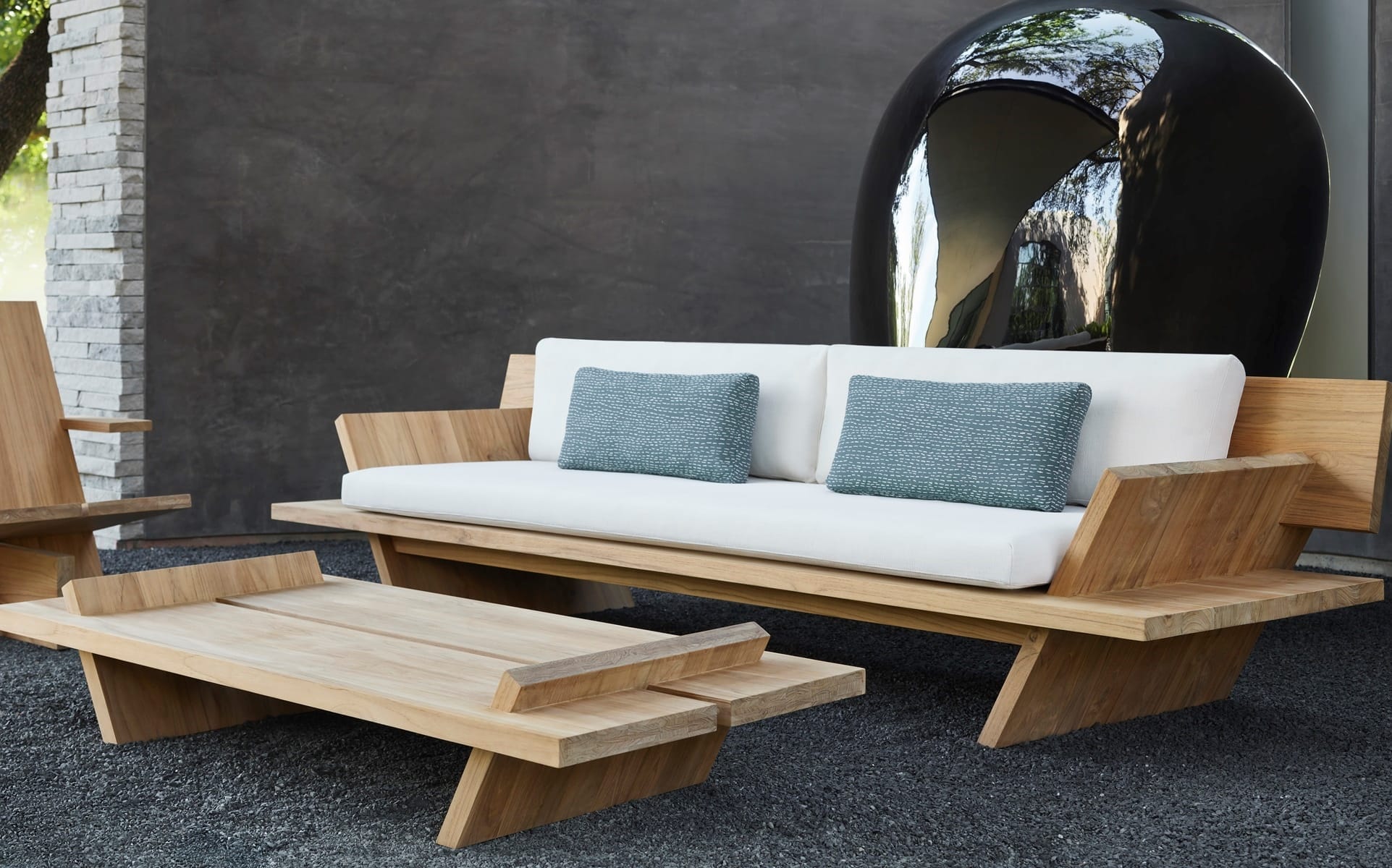 An architectural collection, Wabi Sabi features both teak and aluminum pieces that make a statement in a soulful way.