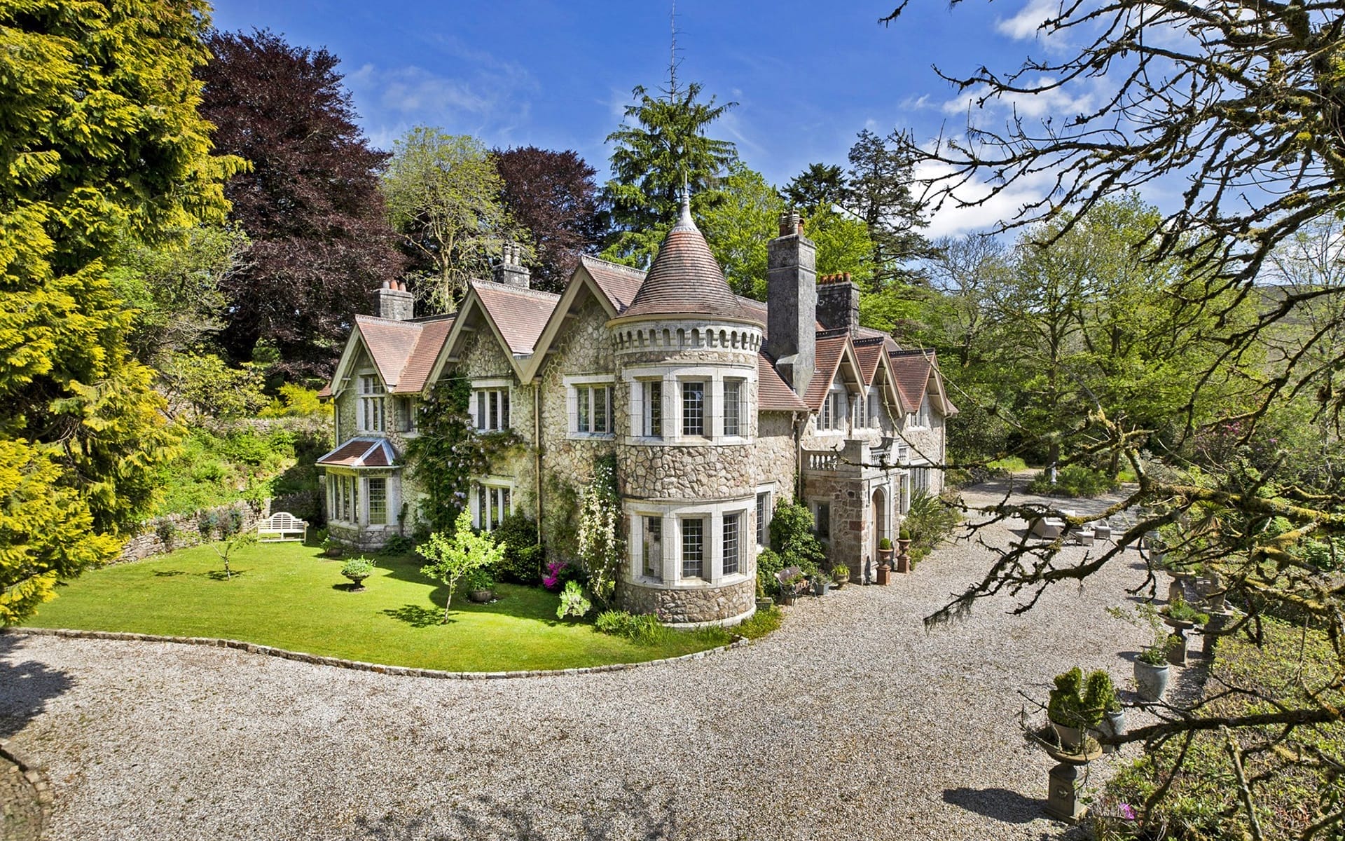 Clad in pink granite with a red-tile roof, the six-bedroom main house has been thoroughly updated by the current owners, who modernized the interiors but retained all of the period charm. Among the highlights are polished granite floors, hand-crafted window mullions, turrets, and custom oak paneling—not to mention a full ballroom. (It is a formal royal dwelling, after all.)