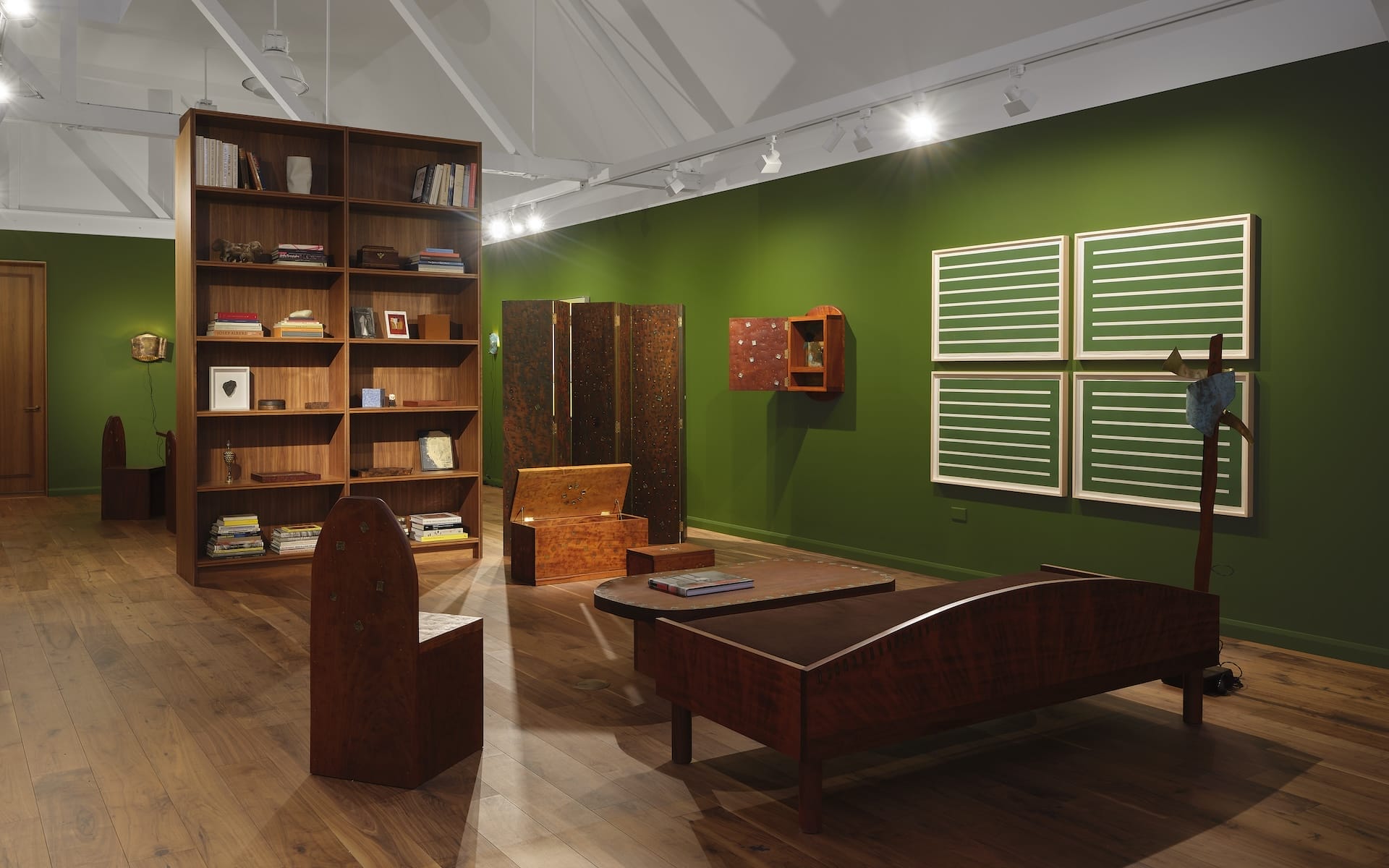 Situated among Triboli’s pieces in the show are his deepest reference points—explorations of color by Josef Albers, a cast bronze sculpture by JB Blunk, and bi-color woodcut prints by Donald Judd—that bring his practice into even deeper focus. His hand-carved wooden boxes, cabinets, and objects resonate with Blunk’s reverence for the natural world and raw materials, while the wax inlays echo Albers. “The relationship between the color of the wood and the color of the wax or bronze is completely different before and after applying the oil I use for finishing,” Triboli says. “Every time I apply the oil, I think of Albers.” His own iridescent lighting fixtures, crafted fluidly to evoke geological artifacts, intensify the transformative effect.