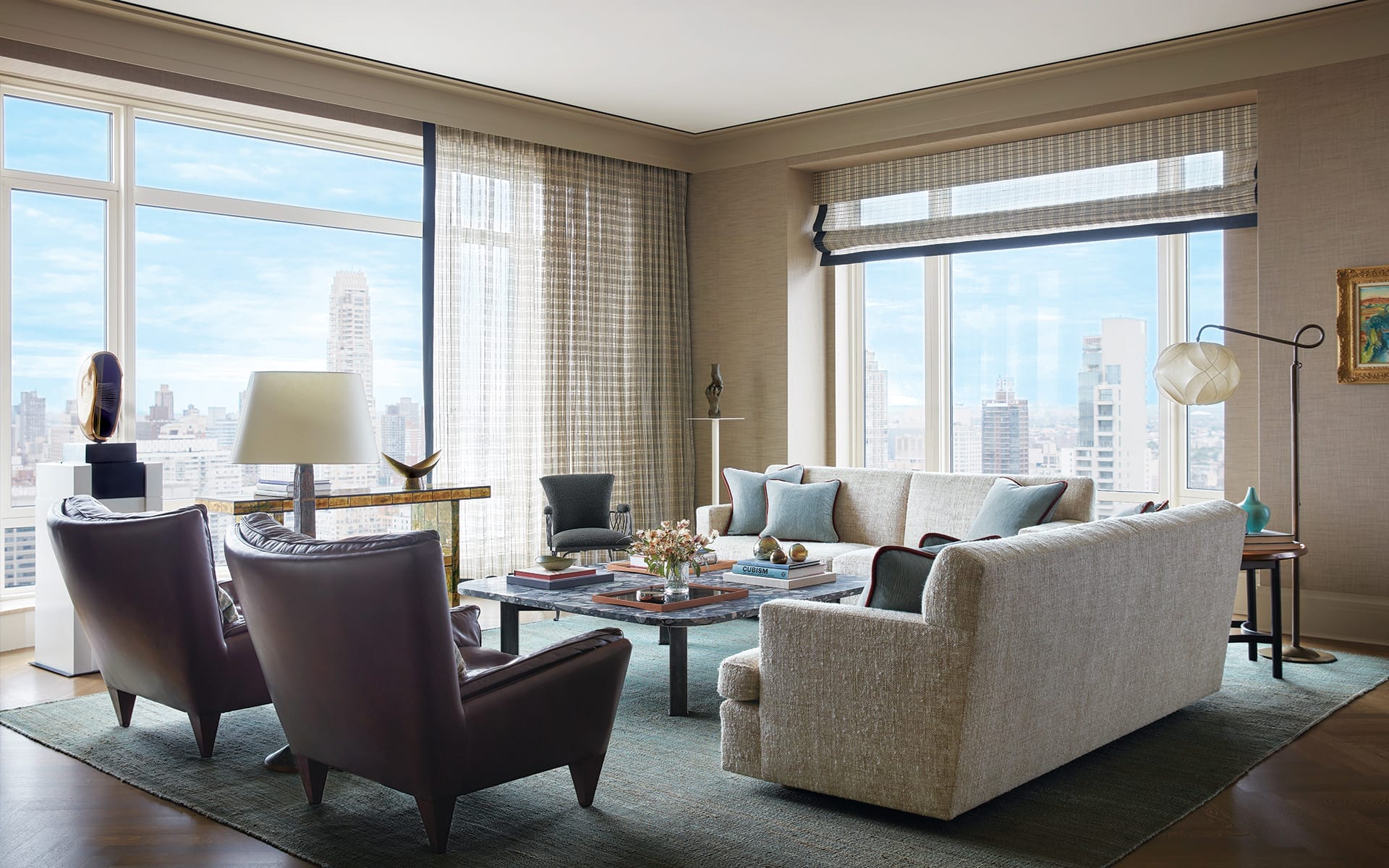 In 2019, a New York couple with a supreme collection of art purchased a high floor in one of these new skyscrapers, in this case a 54-story, limestone-clad condominium designed by one of the masters of postmodern architecture, Robert A.M. Stern. The husband and wife, who have grown children, sought an interior design firm to transform what looked like “a developer’s apartment,” as the wife describes it—well built with quality finishes but lacking in warmth and character—into a tranquil, homey environment that reflects their personalities.