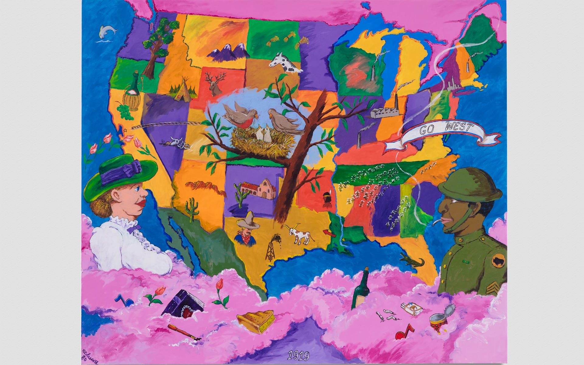 1919 first went on view as part of the retrospective “Art and Race Matters: The Career of Robert Colescott,” which was organized by the Contemporary Arts Center Cincinnati in 2019, before traveling to Portland, Sarasota, Chicago, and finally the New Museum in New York in 2022.