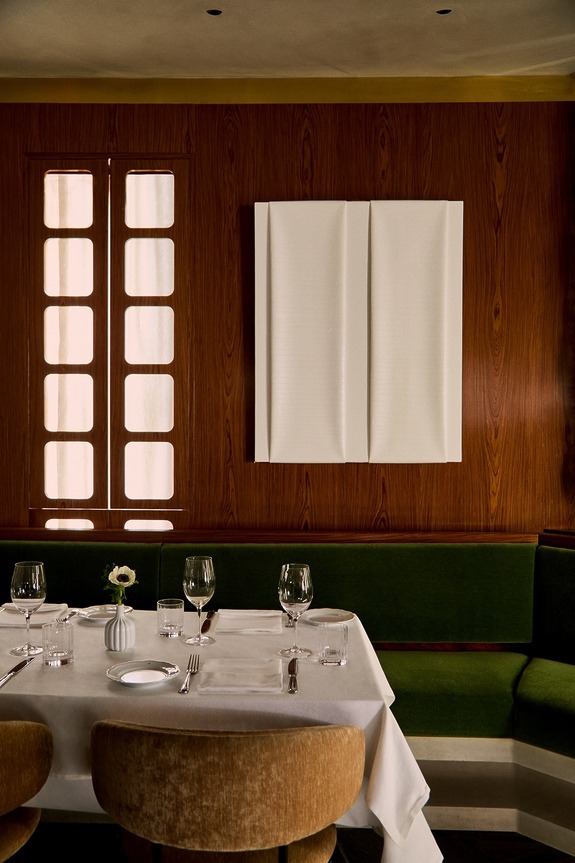 Il Baretto, the bar, strikes a darker, more theatrical tone. Slanted walls and built-in seating heighten its bunker-like sensibility, while another monumental fireplace with a stone base and steel flue in an eye-catching shade of forest green references Carlo Scarpa’s material poetics. “Il Baretto pushes Brutalism even further,” Tagliaferri notes. “Yet it avoids severity by being balanced with luxurious rosewood finishes and upholstered panels, which temper the rawness and create an intimate, almost cocoon-like bar environment.” Luminaires by Italian masters Sergio Mazza, Roberto Pamio, and Stilnovo lend shine to the dining room, as do custom furnishings and artwork by Cesare Berlingeri, Ernesto Burgos, and Oscar Murillo. “Mixing custom pieces with carefully selected vintage is central to my design lexicon,” Tagliaferri says, “and in many ways quintessentially Milanese.”