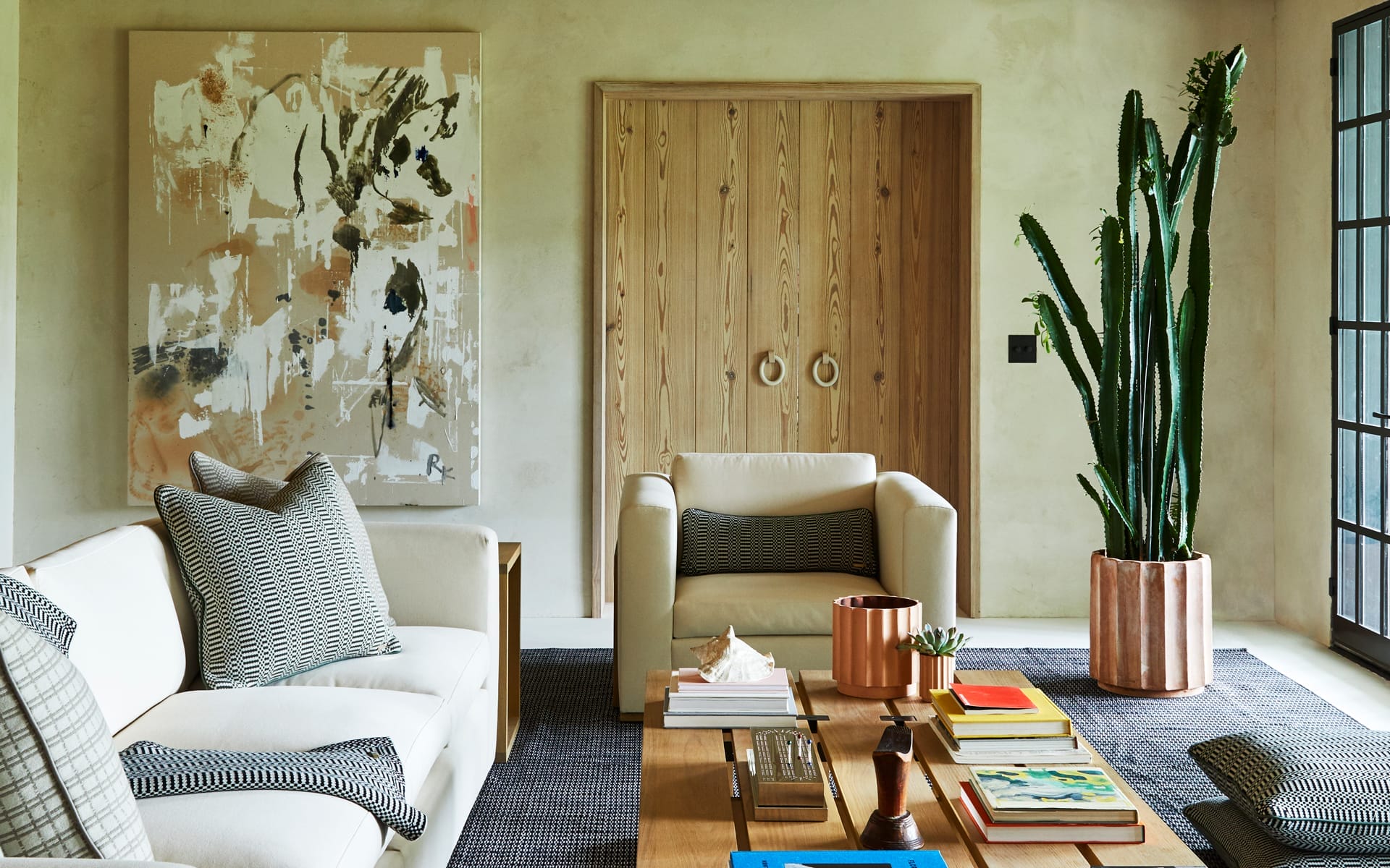 Events Billy Cotton’s Downstairs Living Room at the Galerie House of Art and Design By Galerie editors August 5, 2021 Billy Cotton’s Downstairs Living Room at the Galerie House of Art and Design. Photo: Genevieve Garruppo Interior design by Billy Cotton. @BillyCotton Plaster walls and pastellone floor by Domingue. @dominguefinishes Steel doors by Atelier Domingue. @dominguefinishes Antique heart pine ceiling, bookcases, and trim by Stephen Gamble Historic Floors. @stephengamble_floors.finishes Furniture, rug, pillows, blankets, vases, cribbage board, floor lamps, and pendant all of Billy Cotton’s design. Available on the web Spring of 2022, for special orders please email sales@billycotton.com. Large Abstract painting by Rosy Keyser, courtesyParrasch Heijnen Gallery.@parraschheijnen Wall drawing by Jack Pierson, courtesy of Regen Projects.@regenprojects Small painting of the cosmos by bookcase by Tom Borgese, courtesy of the artist. @tomborgese Tambourine painting by Paul Lee, courtesy of Karma Gallery. @paulhoranlee @karmakarma9 Photographs and Summer Journal images by Brandon Foushee, email brandon.foushee@yahoo.com for print inquiries. @fooshphotos Fabric for upholstery provided by Pierre Frey. @lamaisonpierrefrey Items on bookshelves from the personal collection of the designer. For sales inquiries, please email sales@billycotton.com. Facebook X LinkedIn